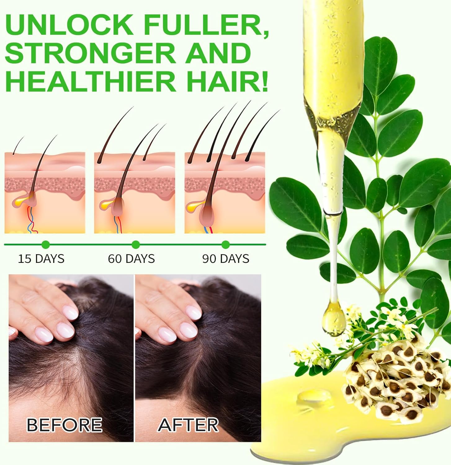 Herstelt glanzend glad haar: Moringa-olie kan de doorbloeding van de hoofdhuid bevorderen en rijke voedende ingrediënten voor het haar leveren, die de haargroei bevorderen, het haar voeden en het haar sterk, glanzend en sterk kunnen maken. Gebruik 2-3 druppels Moringa haargroeiolie voor voller haar.