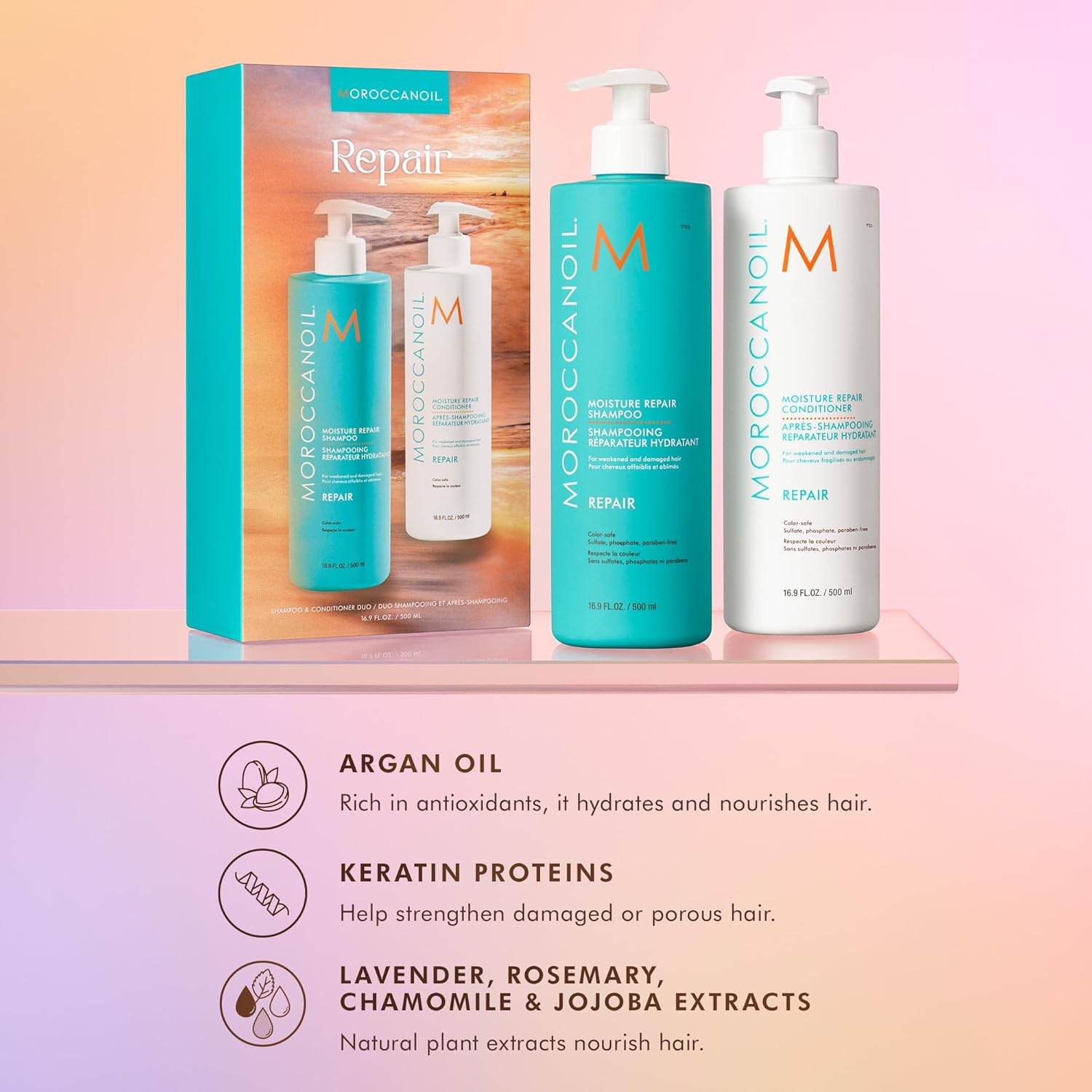 Verzorg beschadigd haar met de set van een halve liter gelimiteerde editie. De combinatie van Moroccanoil hydraterende herstellende shampoo en conditioner reinigt, ontwart en helpt haar te versterken dat is beschadigd door kleur- en chemische behandelingen of styling door warmtebehandelingen. De zeer effectieve formules bevatten arganolie, keratine (proteïne) en vetzuren en zorgen voor sterker haar dat een gezondere uitstraling heeft en eenvoudiger in model te brengen is. Heeft de kenmerkende geur van Moroccanoil, een mix van kruidige amberaroma’s en zoete bloemige tonen.