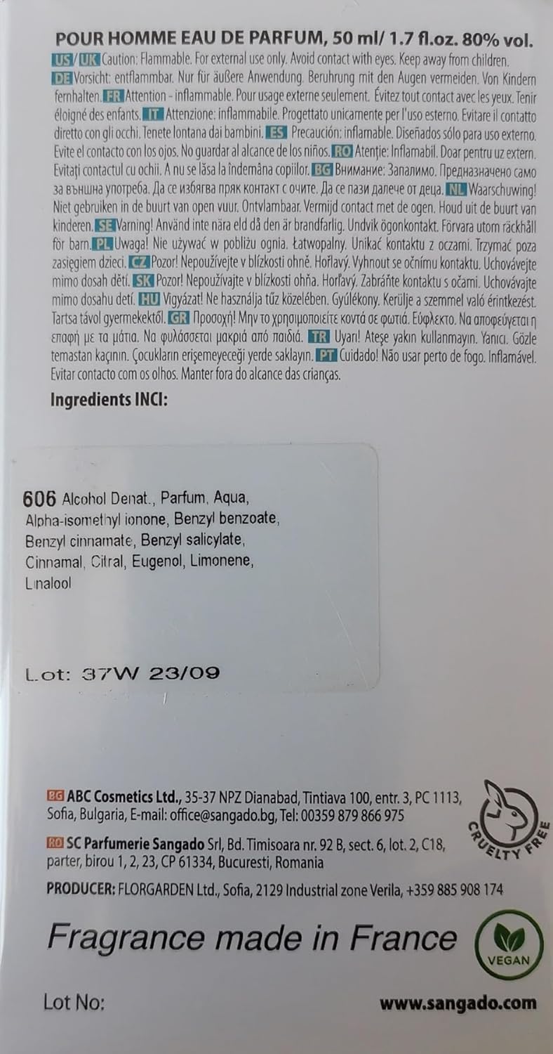 SANGADO GEUREN ZIJN GEBASEERD OP FIJNE INGREDIËNTEN VAN HOGE KWALITEIT. Het merk SANGADO werd gecreëerd door Parfumeur-Créateur Daniel Sangado. Onze parfums zijn gebaseerd op zuivere Franse essentiële oliën van topkwaliteit. Deze zorgvuldig geselecteerde superieure essentiële oliën zijn het echte werk en staan garant voor de kwaliteit van onze parfums. Ze zijn rijk aan karakter over het hele spectrum van noten (top, midden en bodem) die harmonieus voelbaar zijn naarmate de geur zich in de tijd ontvouwt. Wij geloven dat we absoluut de best mogelijke ingrediënten gebruiken voor een goedkoop parfum.