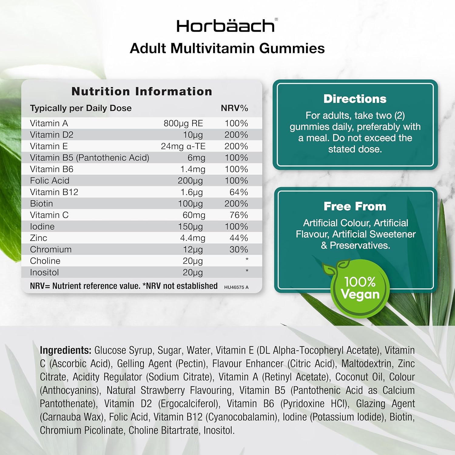 WAAROM HORBAACH MULTI VITAMIN GUMMIES KOPEN? Onze Adult gummies zitten boordevol essentiële vitaminen en mineralen, waaronder: Vitaminen A, B3, B5, B6, B12, C, D2, E, Biotine, Foliumzuur, Jodium, Chroom, Choline & Zink.