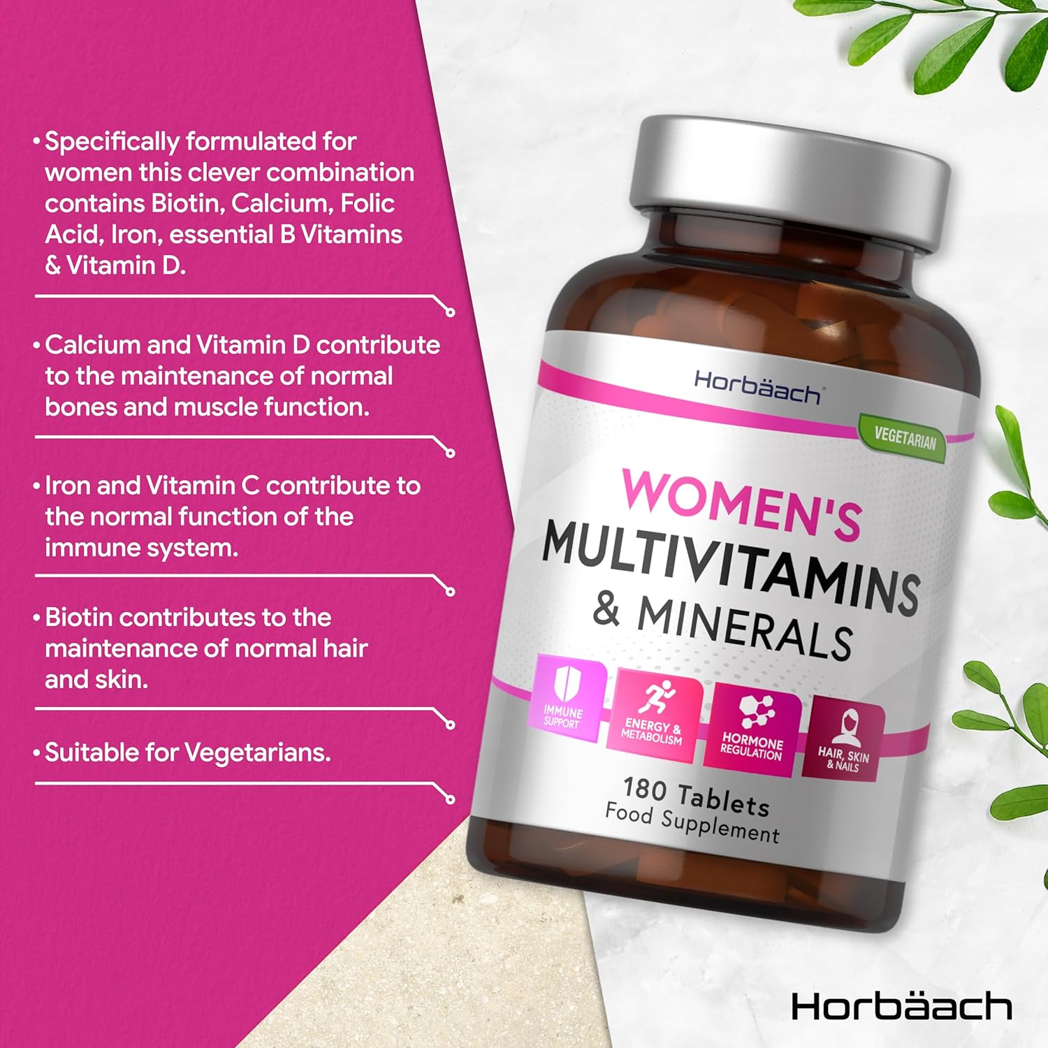 Multivitamin Women met Vitamine D3, Biotine, B6, Foliumzuur, Ijzer en meer! | 6 maanden voorraad – 180 Tabletten | Multivitamin Women | Vegetarisch | Horbaach