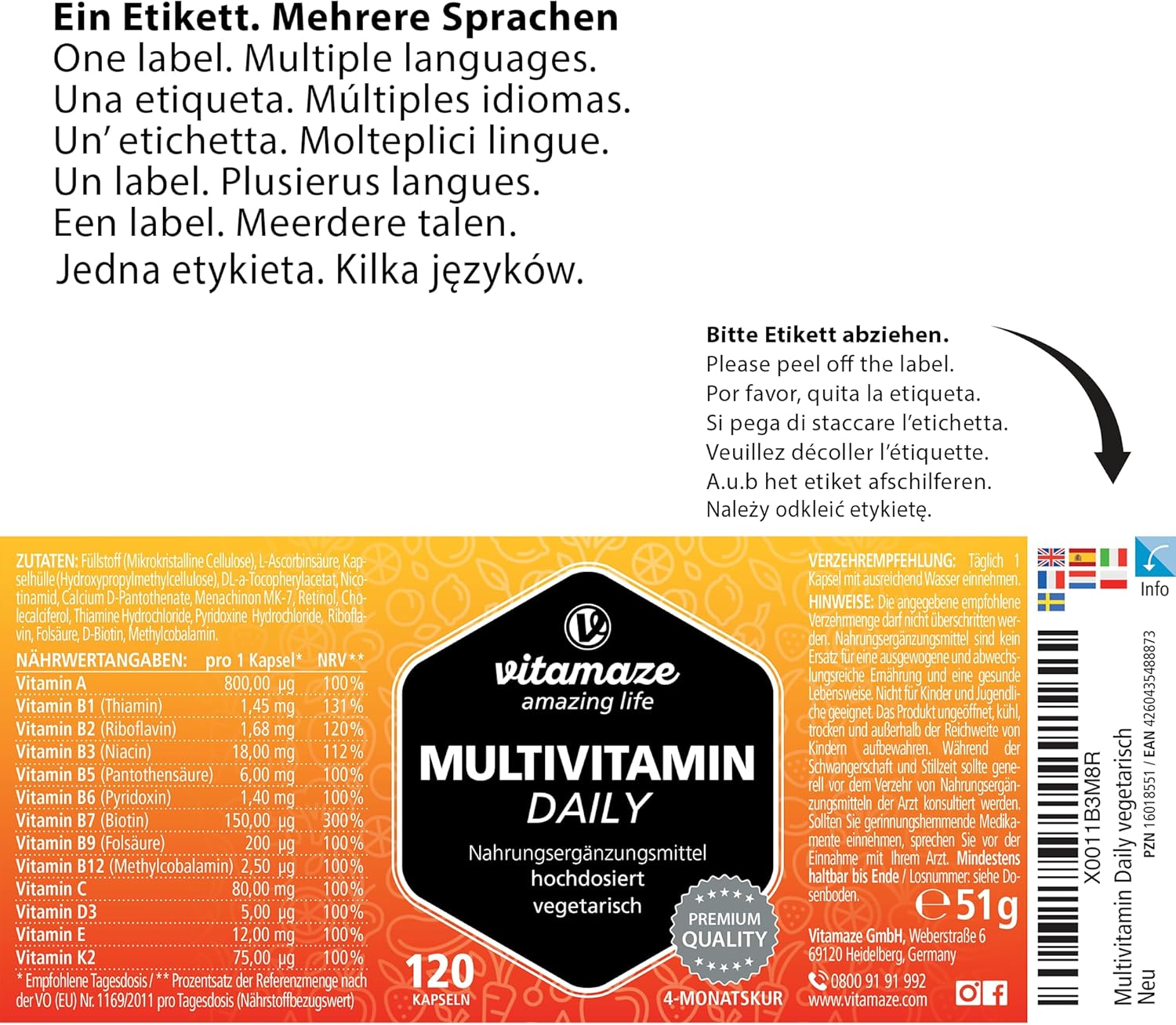 Multivitamine Hoge Dosis, 13 Vitaminen A, B, C, D, E, K, 120 Vegetarische Capsules voor 4 Maanden, Organisch & Natuurlijk Supplement zonder Additieven, Made in Germany