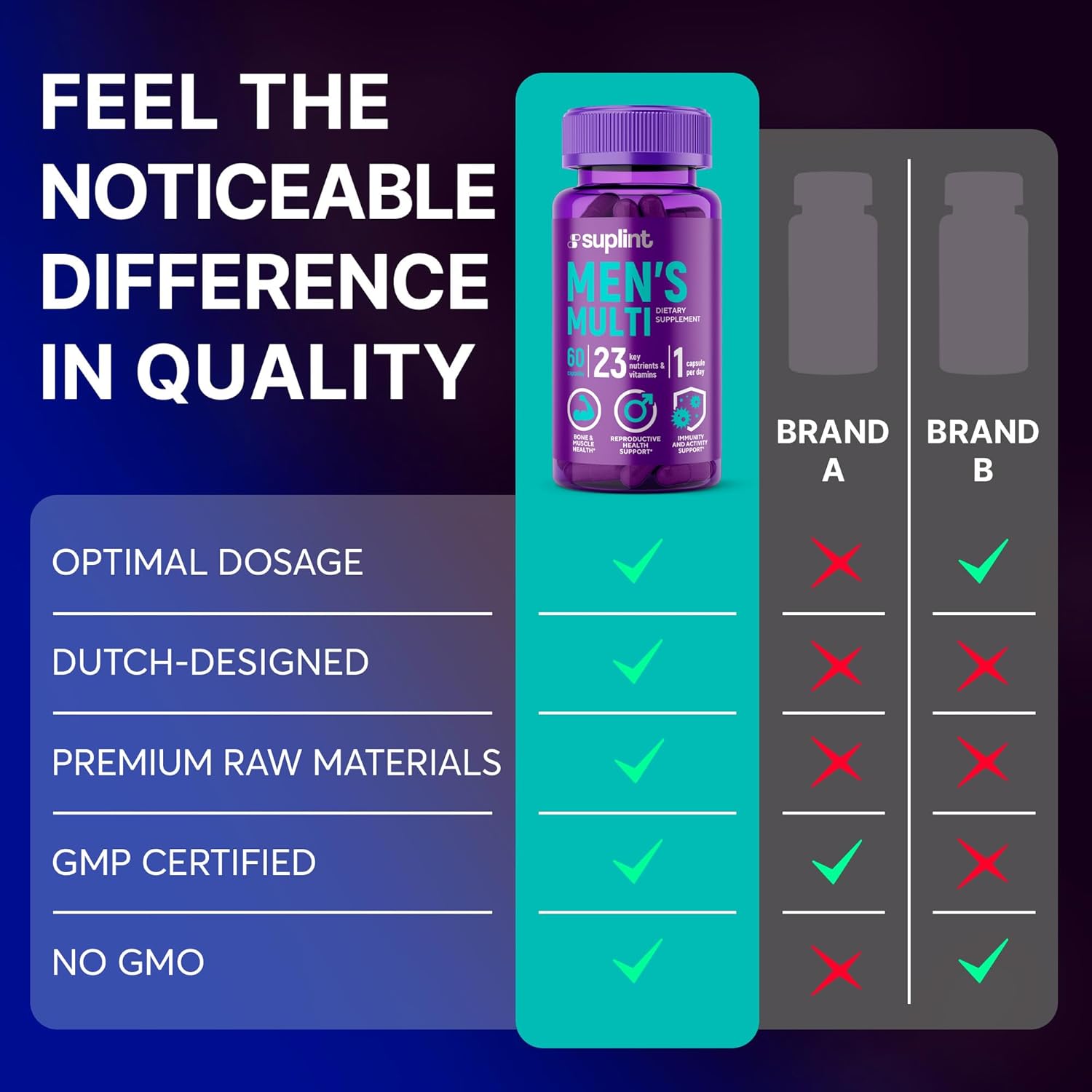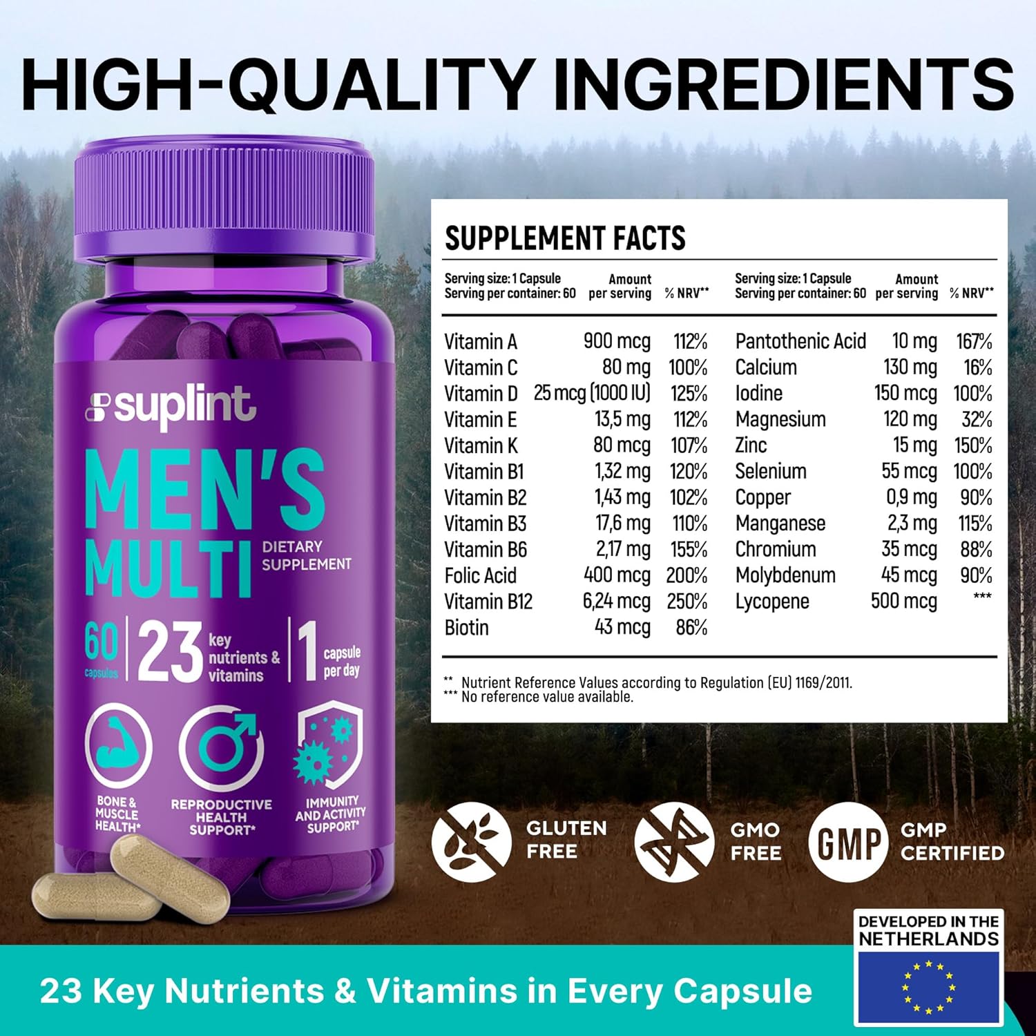 Premium kwaliteit en veiligheid: ons multivitaminepreparaat voor mannen wordt door toonaangevende wetenschappers in Nederland ontwikkeld en volgens de hoogste kwaliteitsnormen geproduceerd. Wij kopen onze ingrediënten wereldwijd en zorgen ervoor dat elke capsule uit de beste materialen bestaat: vrij van genetische manipulatie, glutenvrij en veganistisch.