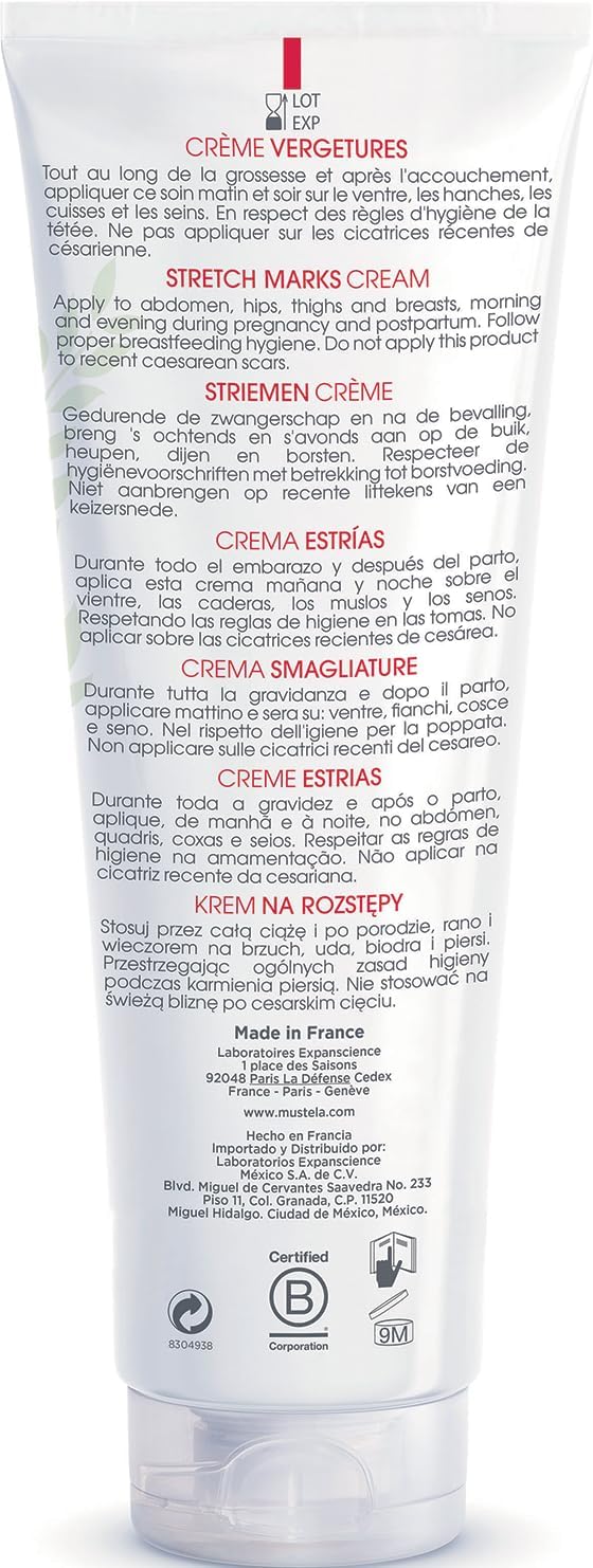Mustela Stretch Mark Cream is speciaal samengesteld om huidstriemen te voorkomen. De aangename, zintuiglijke en romige textuur trekt gemakkelijk in en is niet vet. Voor alle vrouwen. Mustela garandeert de veiligheid van moeder en kind: het product is dermatologisch getest, met garantie van onschadelijkheid tijdens de zwangerschap en postnatale periode, compatibel met borstvoeding in overeenstemming met de hygiënische voedingsregels. Het hydrateert de huid langdurig dankzij avocado-olie en peptiden en versterkt de elasticiteit (polyfenolextract van Maracuja). Het bevat ook Toverhazelaar (activeert de productie van elastine- en collageenvezels) en Sheaboter (plantaardig vet dat de opperhuid verzacht en voedt). Het heeft een verzachtende werking op de droge en gevoelige huid die onderhevig is aan klimatologische agressies. Delicate geur. Gebruiksadvies: schep 3 walnoten crème tussen je handen, verwarm een beetje en masseer op de aangetaste zone (buik, dijen, billen en borsten). Niet aanbrengen op littekens en eventueel op keizersnedes. Het bevat 96% ingrediënten van natuurlijke oorsprong, de overige 4% zijn ingrediënten geselecteerd voor hun hoge verdraagbaarheid die een langdurige bescherming van de formule garanderen.