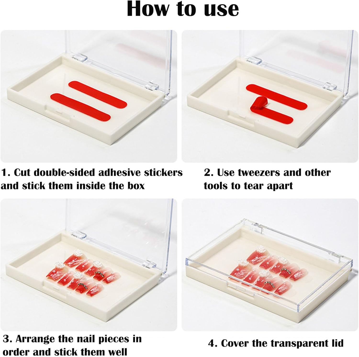 Nail Packaging Kit:Includes 20pcs clear nail boxes (7.5×7.5×1.5cm), 90pcs double-sided adhesive strip (5.5×0.5cm). The Press on Nails Packaging Set just the right size for a set of artificial nails, which is equipped with double-sided adhesive strips to better meet your packaging needs.