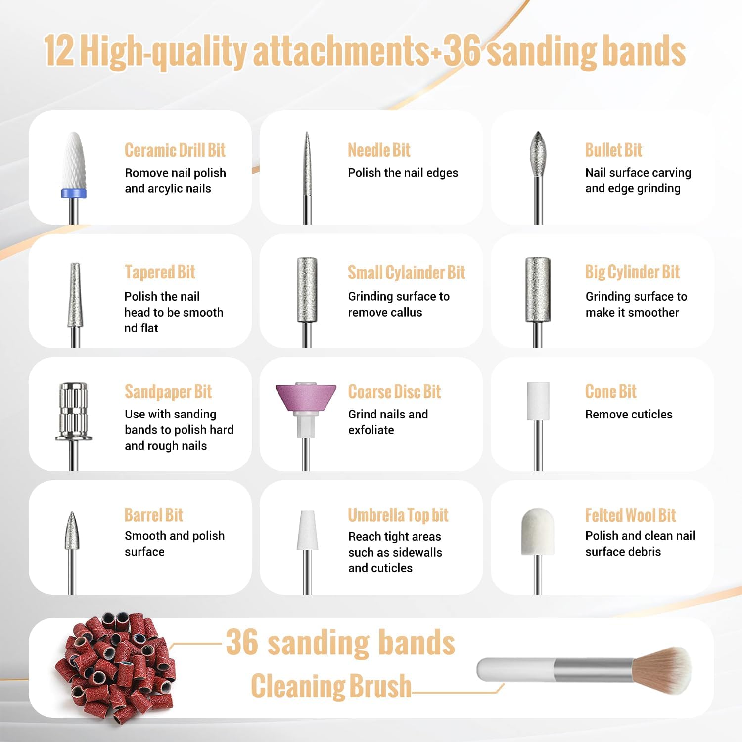 【Multifunctionele nagelboorkit】Denabuty elektrische nagelvijl wordt geleverd met 12 soorten metalen nagelboren, 36 stuks schuurbandjes, 1 reinigingsborsteltje, dat kan voldoen aan verschillende nagelverzorgingsbehoeften, zoals acrylnagels, gelnagels, dompelpoedernagels, natuurlijke nagels, en nagelriem dode huid, eelt, dikke nagels.