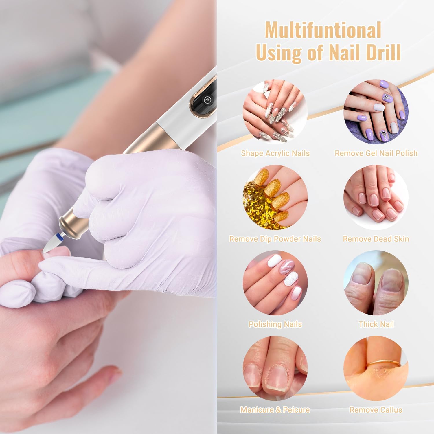 【Professionell och kraftfull】 nagelborrmaskin Uppgraderad kraftfull motor är perfekt för alla dina manikyr- och pedikyrbehov, inklusive att ta bort akrylnaglar, polygelnaglar, skalbaggargel, dopppudernaglar, formning, polering, nagelband, död hud och tjocka naglar.