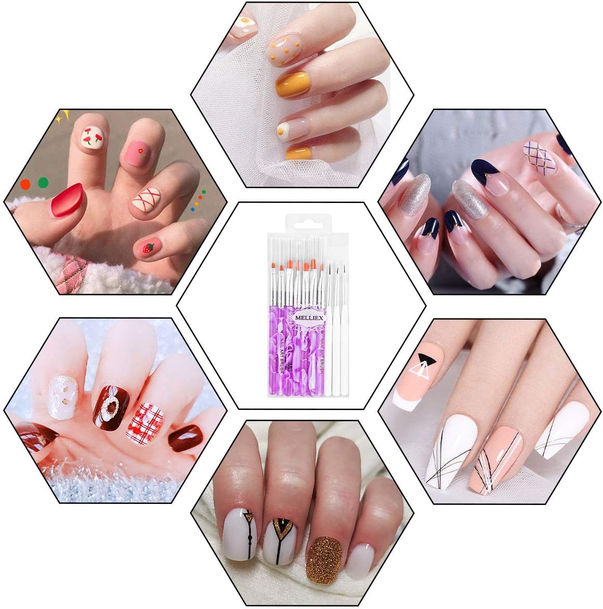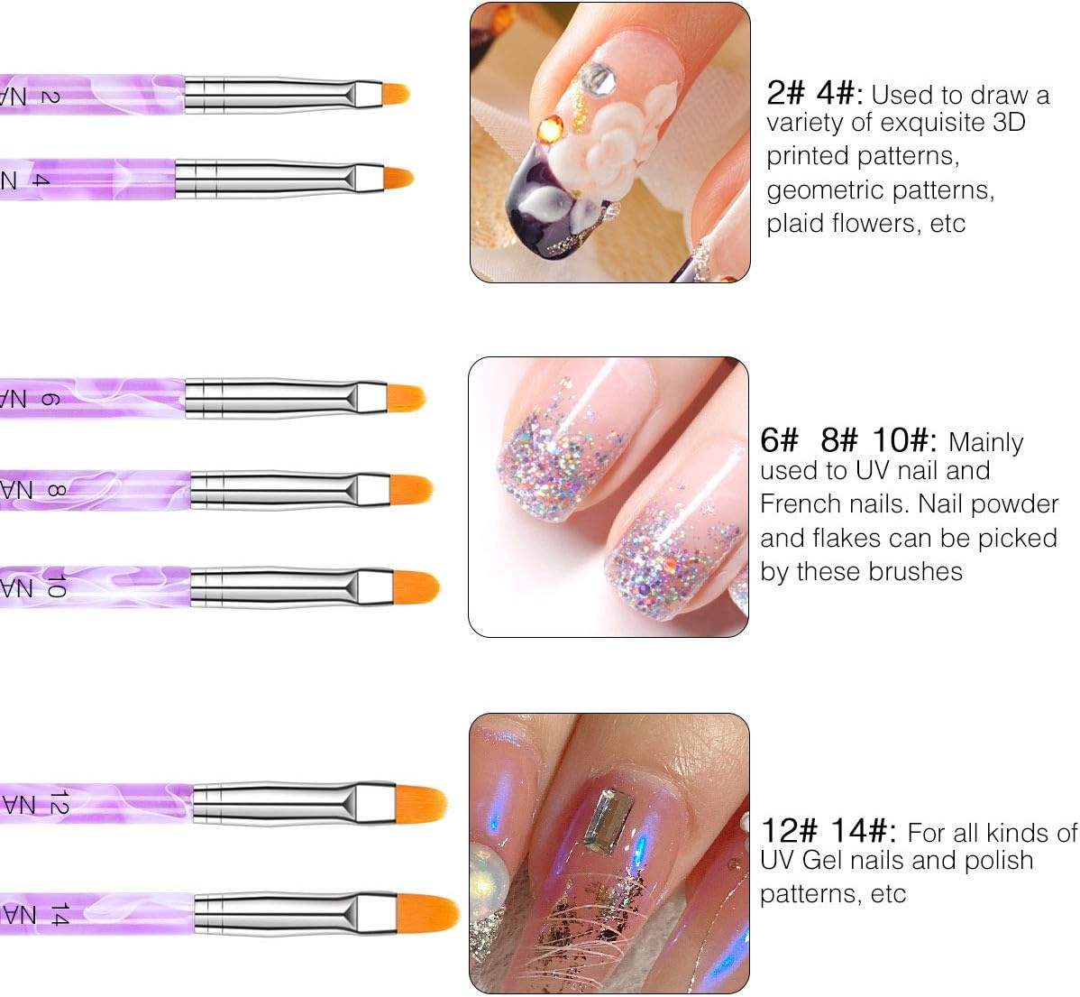 10 verschillende penselen – het wordt geleverd met 10 verschillende gelnagelpenselen die aan je verschillende eisen voldoen. De paarse nagelkwasten zijn geschikt voor het tekenen van grote patronen, en witte nagelkwasten zijn geschikt voor het tekenen van fijne patronen.