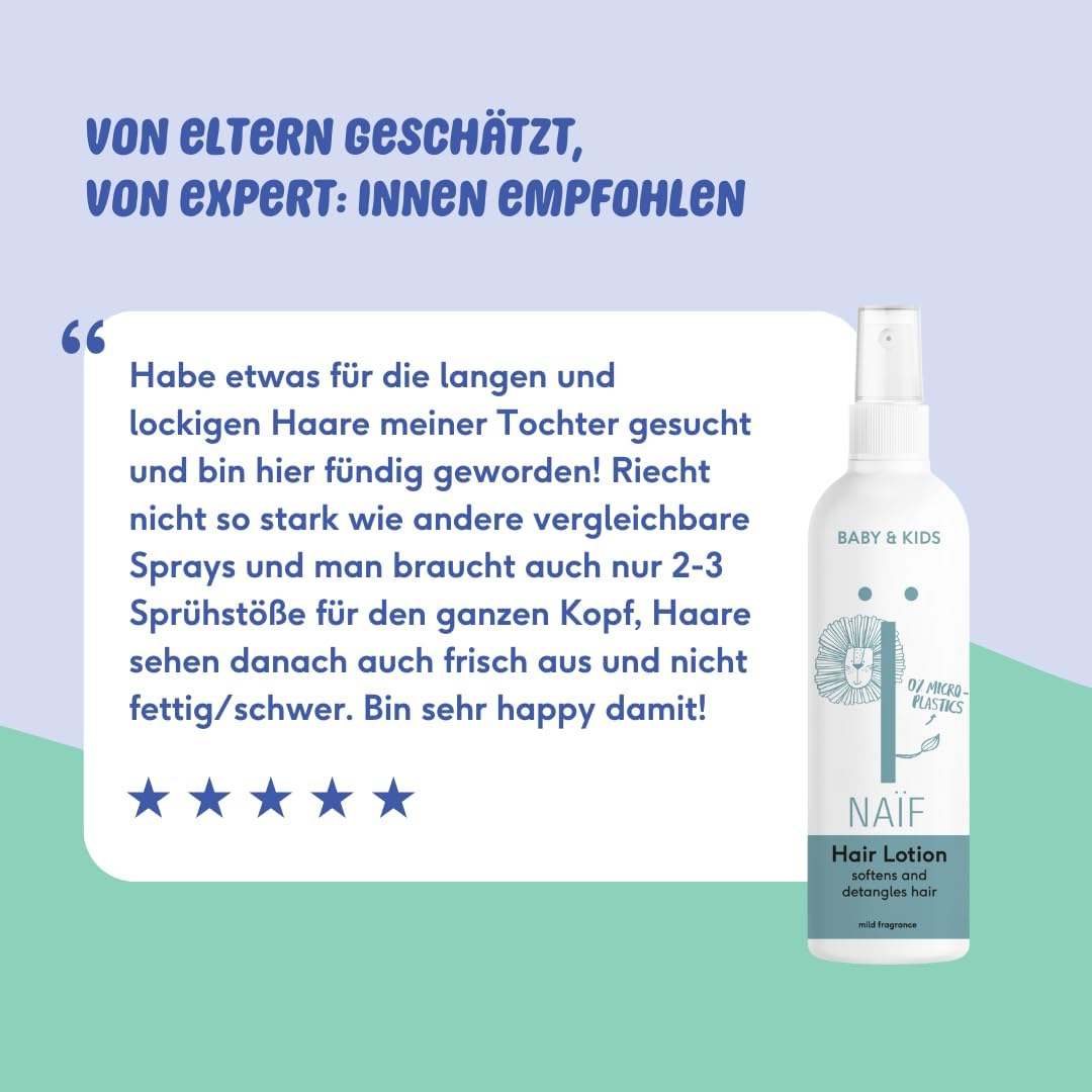 6 reviews for Naïf – Ontwarrende haarlotion – voor baby’s en kinderen – Natuurlijke ingrediënten – Hydraterend – 0% microplastics en alcohol – Tegen haarknopen – 150ML