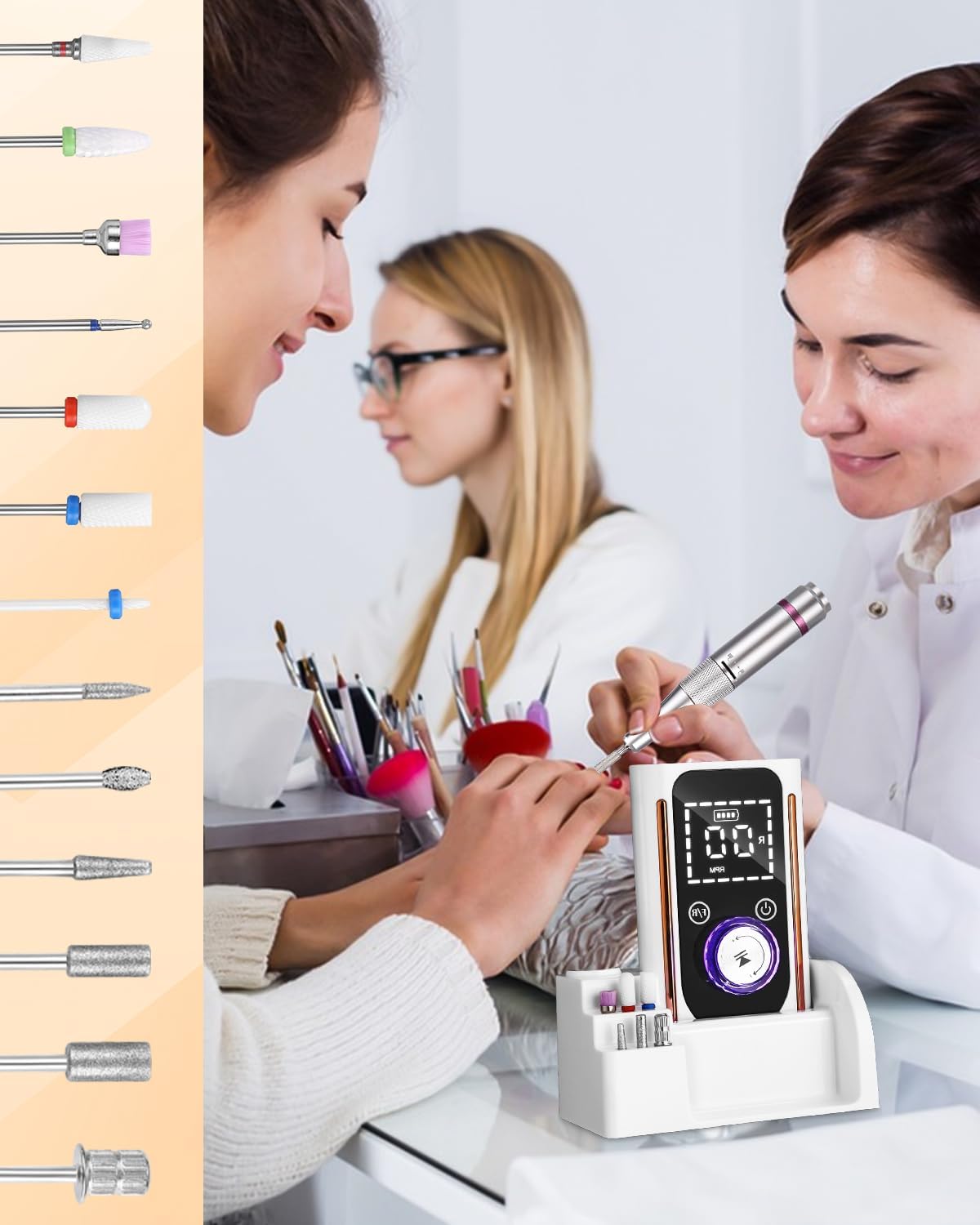 Complete tool set and 13 interchangeable milling attachments: This electric nail file comes with 13 different nail milling attachments, which can handle all kinds of tasks such as grinding, cutting, polishing, etc. Effortlessly apply so you can quickly remove gel nail polish, cuticles or dead skin without damaging your nails. The cutter attachments are quick and easy to replace, whether for daily care or professional manicure.