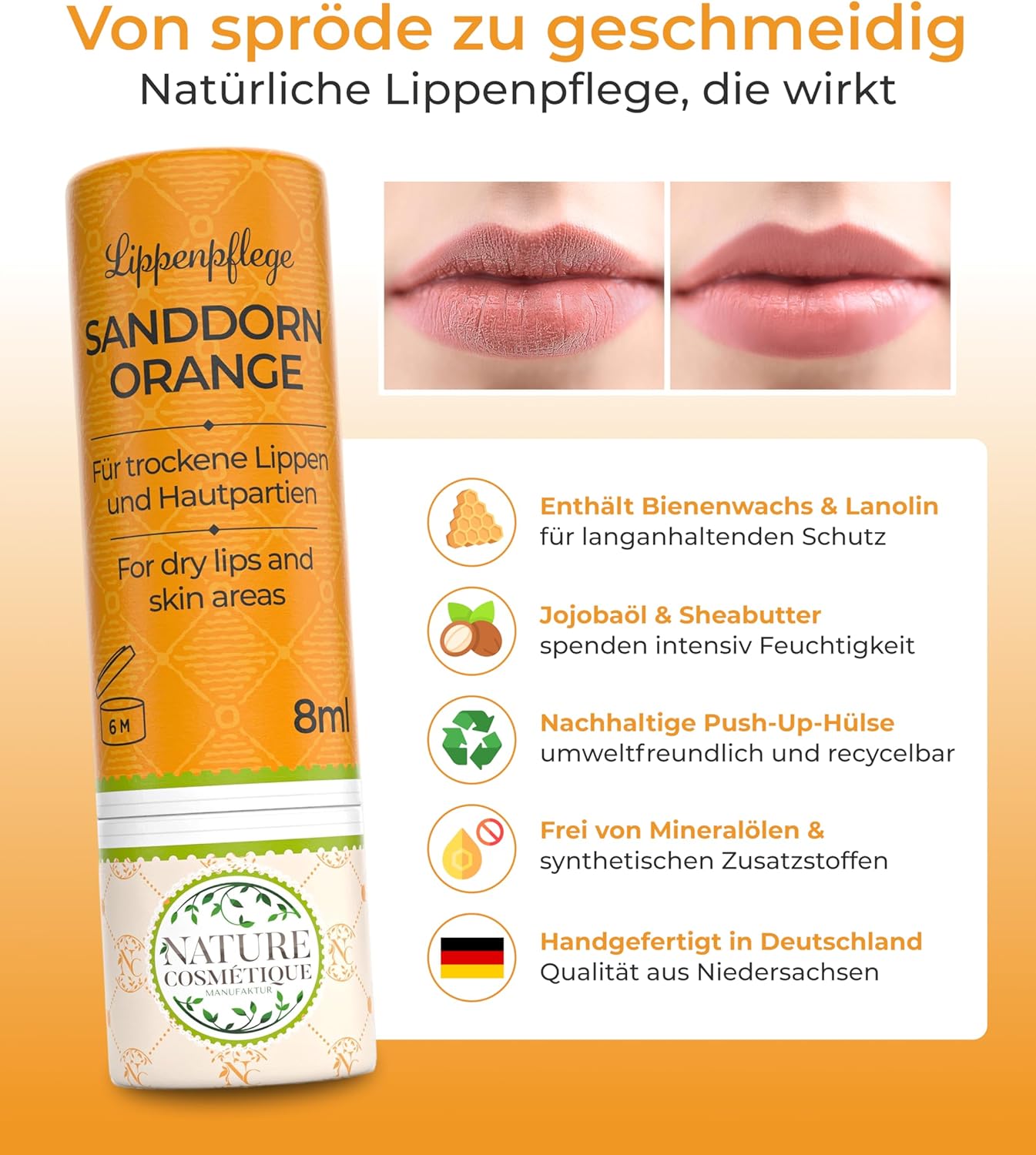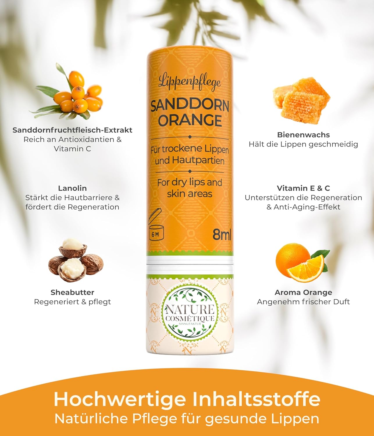 Nature Cosmétique® Lip Care Sea Buckthorn Orange Lip Care for Dry and Cracked Lips with Beeswax, Jojoba Oil and Vitamin C, Durable Paper Sleeve, Made in Germany