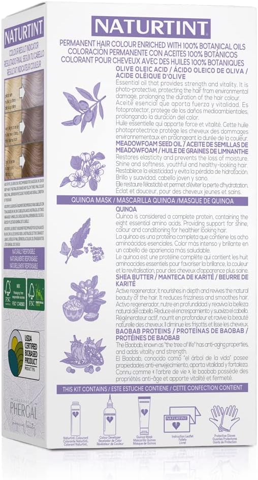 Naturtint is een permanente kleuring zonder ammoniak en 100% dekking van grijs haar, gekozen door consumenten die op zoek zijn naar zachtheid, glans, hydratatie en comfort voor de hoofdhuid. Het respecteert de gezondheid van het haar en bevat het Multicare Mask met Quinoa, dat de kleurfixatie met 20% verhoogt. Inhoud van de doos Flesje Naturtint kleurstof, flesje kleurontwikkelaar, verzorgende balsem, gebruiksaanwijzing en beschermende handschoenen.