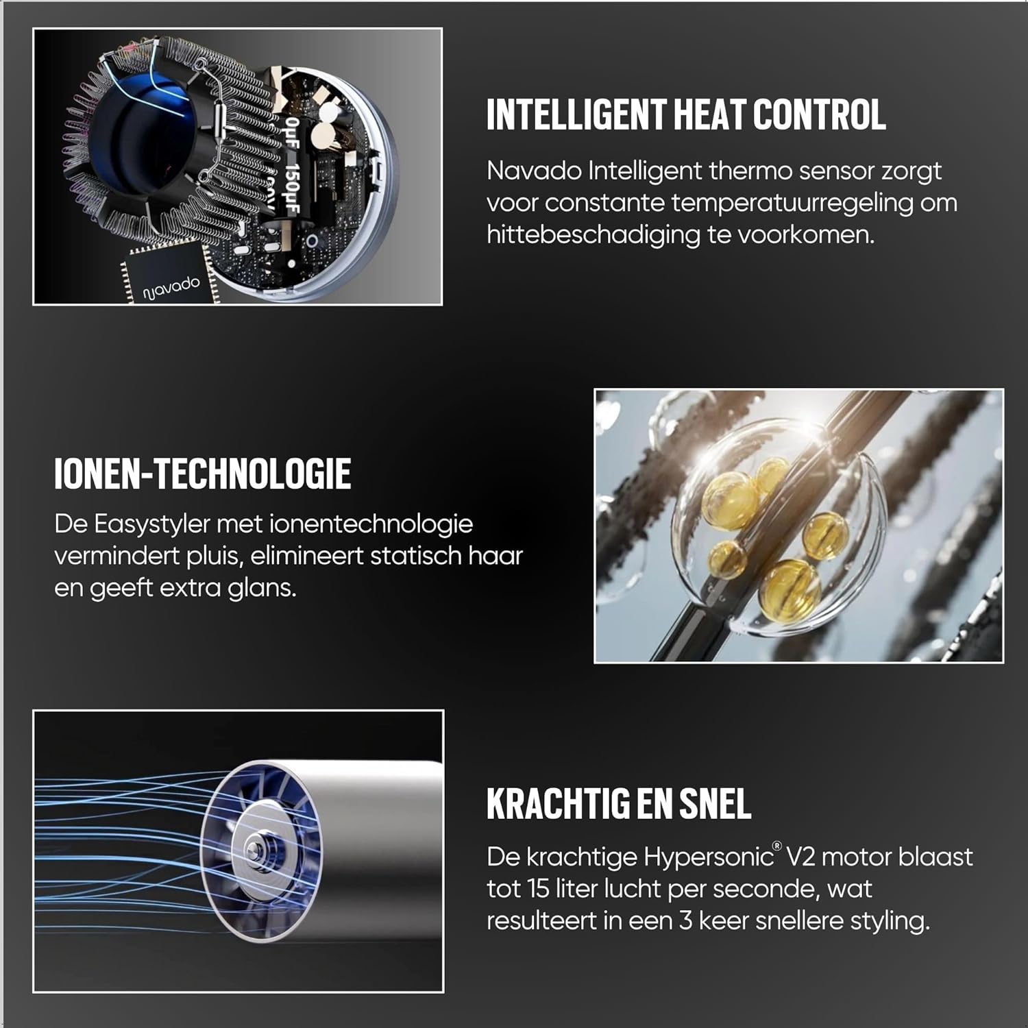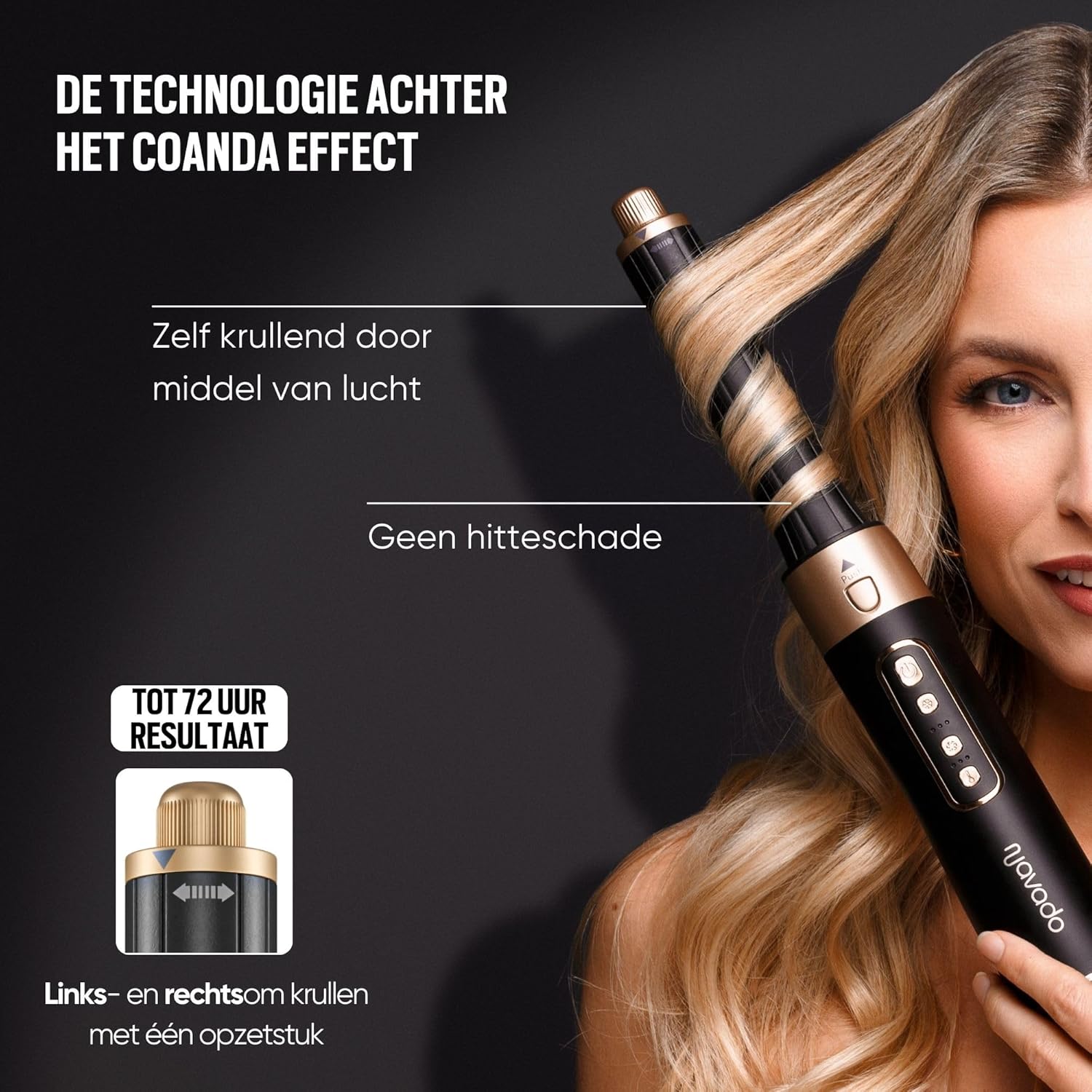 Betrouwbaar, kwaliteit, designIk ben heel tevreden over de Navado easystyler.Hij pakt het haar goed om krullen te maken.De krullen blijven goed zitten!De temperatuur wordt steeds gecontroleerd.Makkelijke bediening.3 blaasstanden3 warmte standen1 cool shotFijne betrouwbare klantenservice met goede garantie voorwaarden.Geweldige airwrap!