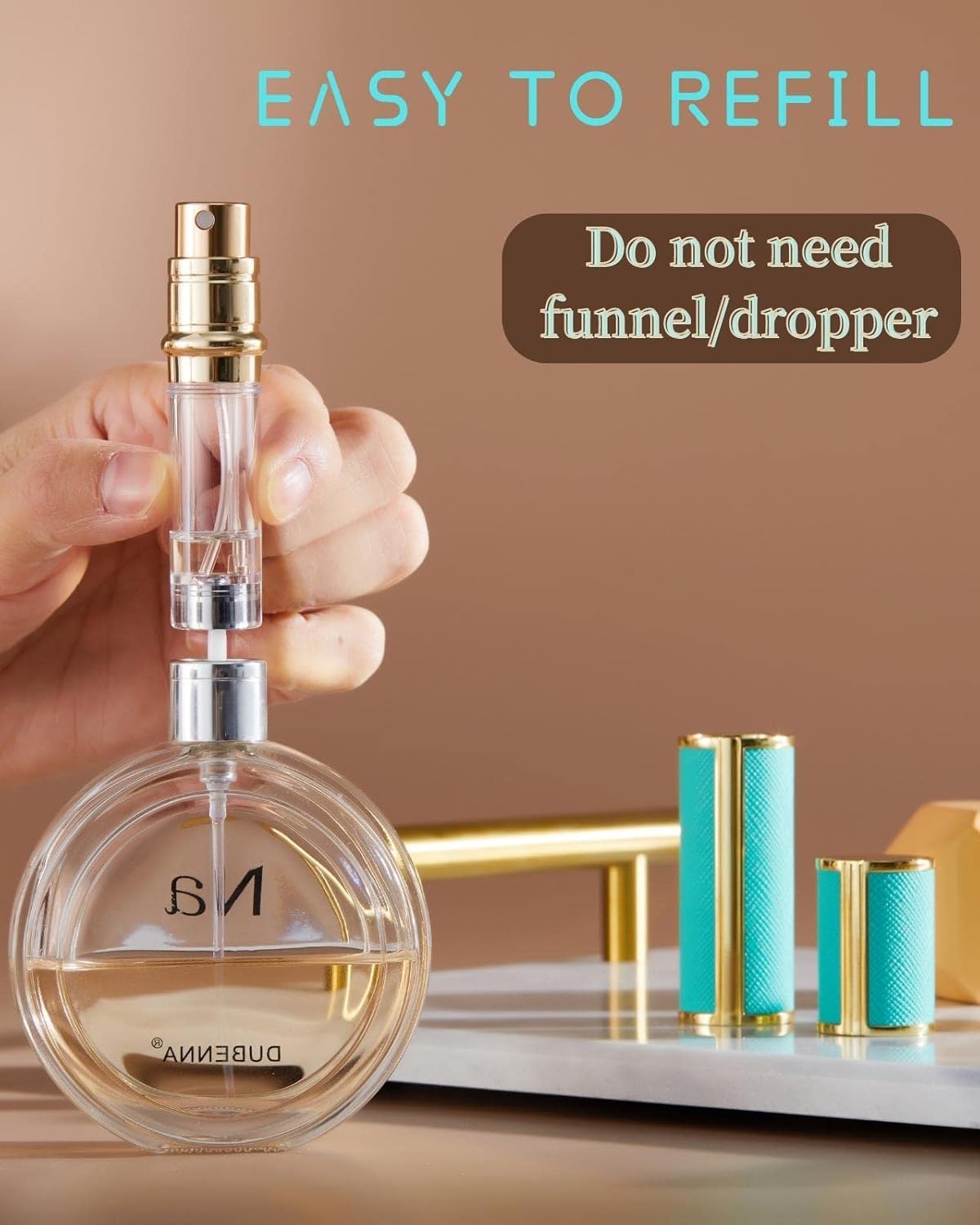 Eenvoudig bijvullen en herbruikbaar: bodemvulontwerp voor eenvoudige navulling. Richt gewoon de bodem van de spuitfles op het parfummondstuk en druk de spuitfles herhaaldelijk op en neer en de navulling is voltooid, zonder trechter, druppelaar enz. nodig.