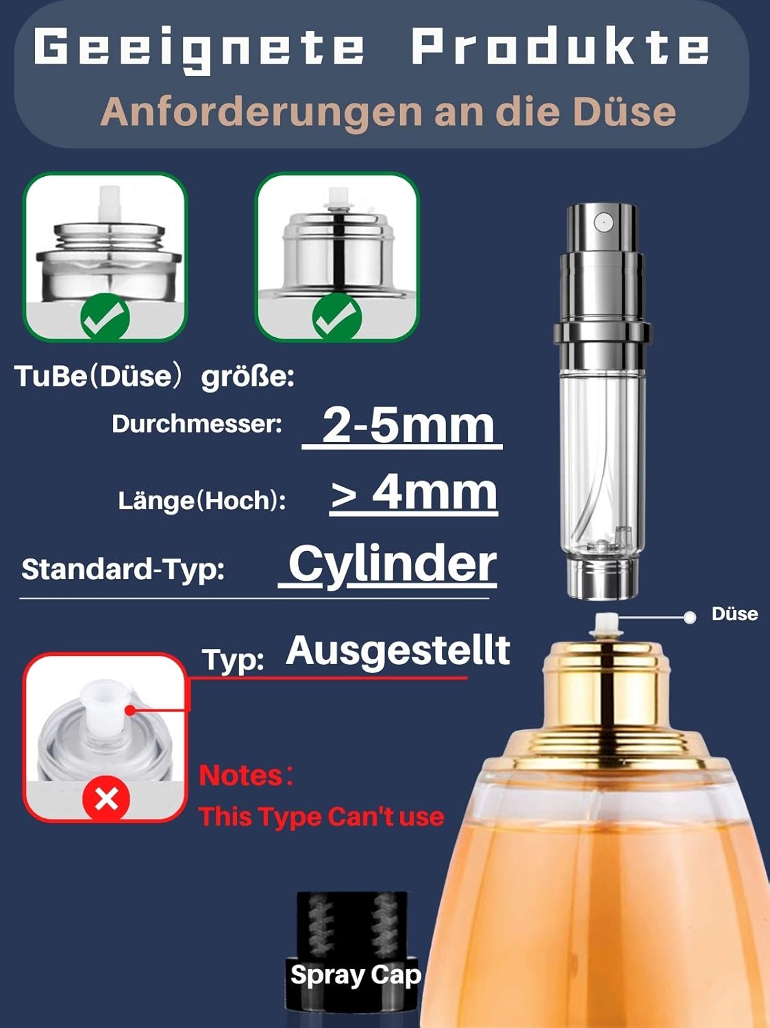 Geschikte parfum: de parfumspuitfles is geschikt voor parfums met afneembare pompkop. Het pompbuisje moet groter of gelijk zijn aan 4 mm en de diameter moet kleiner zijn dan 4 mm.