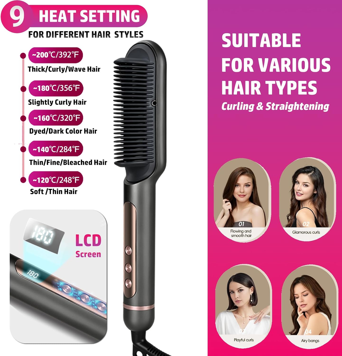 💗【9 warmte-instellingen en LED-display】 – Deze stijlborstel biedt 9 instelbare temperaturen om op meer haartypes en texturen te werken. Uitgerust met een LED-display, kunt u met slechts één klik de temperatuur nauwkeurig afstemmen op uw haartype, waardoor het stylen efficiënter en gemakkelijker dan ooit wordt. U kunt de optimale temperatuur kiezen om keer op keer salonwaardige resultaten te garanderen.