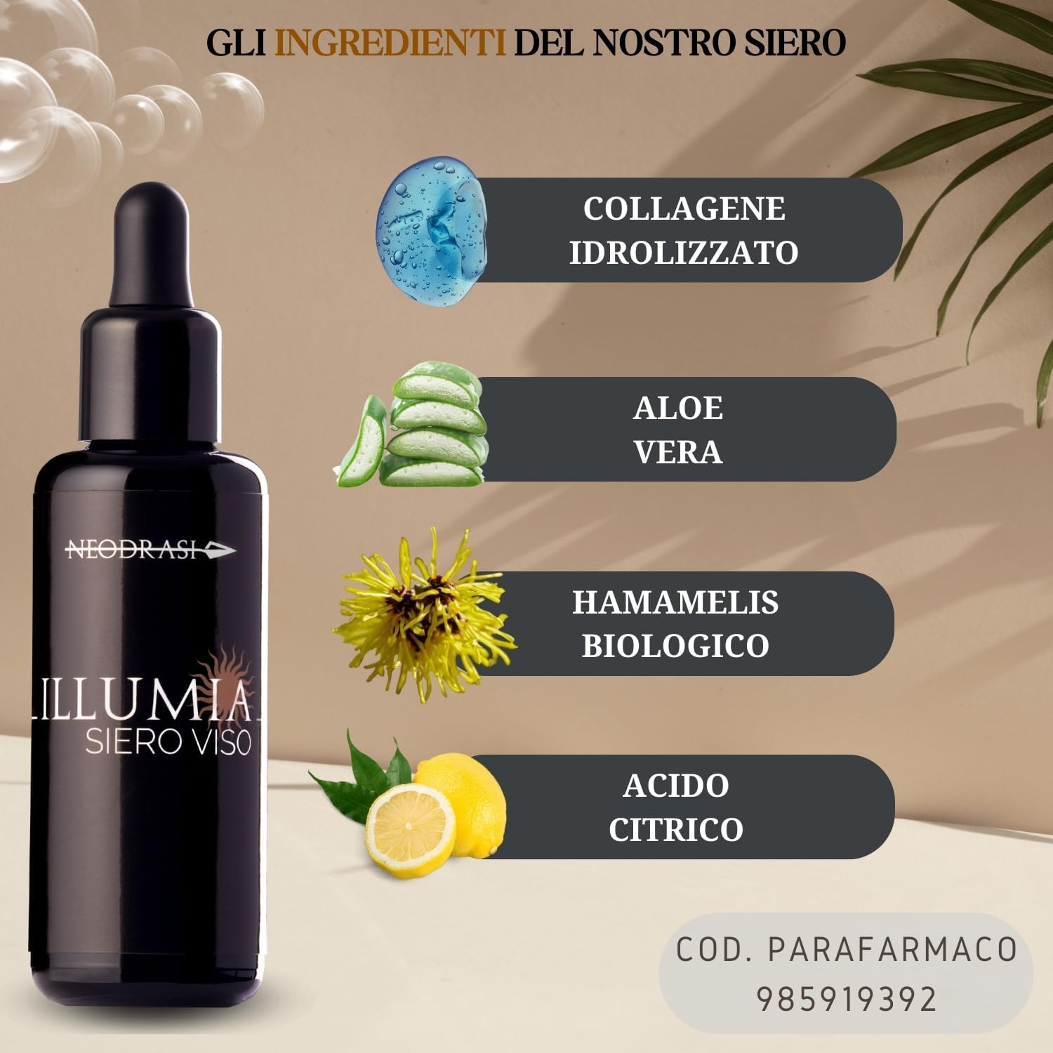 Neodrasi Illumia Gezichtsserum met Antioxidanten en Hydraterende werking, met Vitamine C, Hyaluronzuur, Marien Collageen, Vitamine E en Fyto-Retinol (Plantaardige Vitamine A) – Met een Verhelderend en Anti-Aging Effect – Gemaakt in Italië.