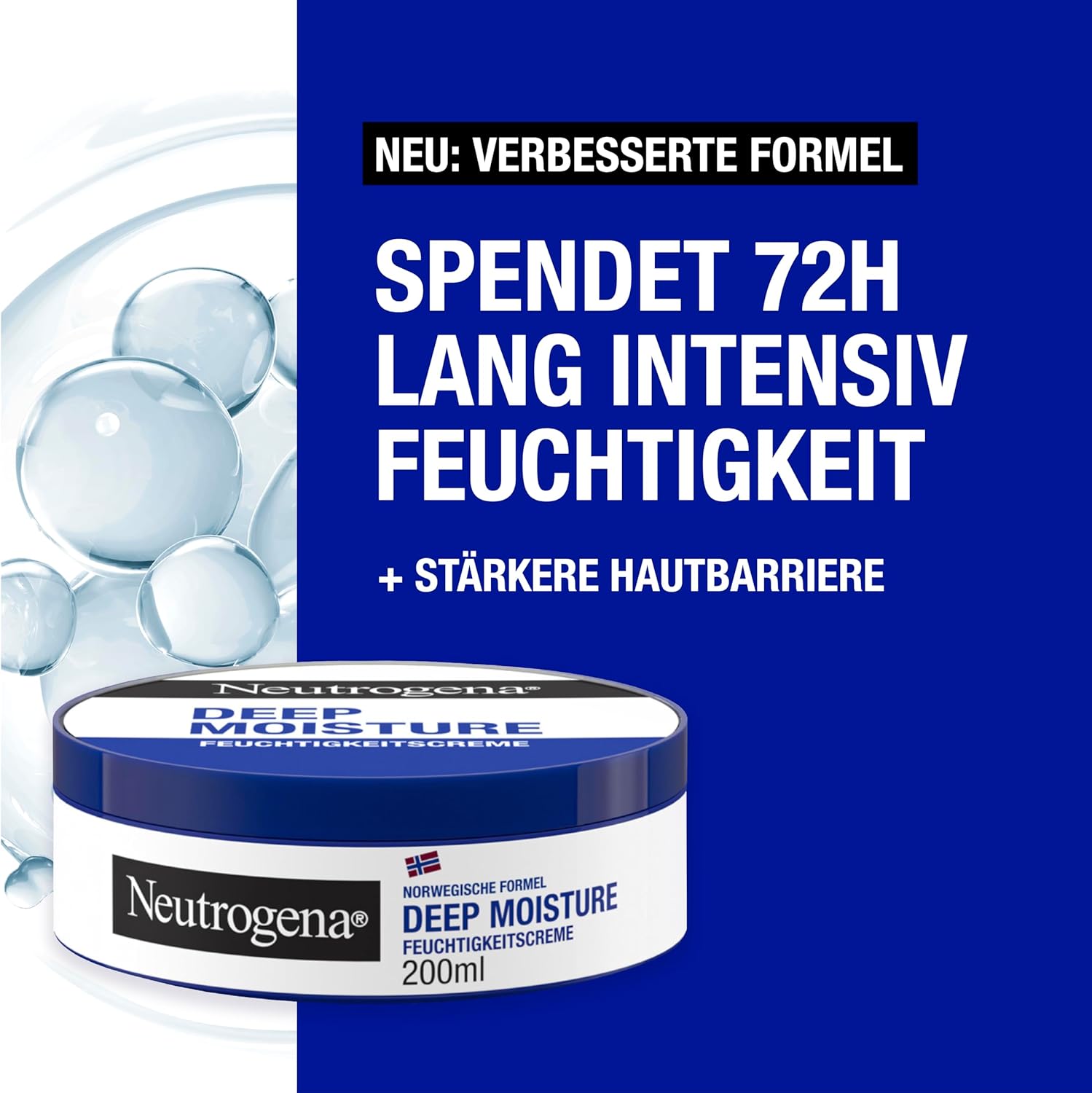 De Neutrogena Noorse formule Deep Moisture vochtinbrengende crème voor droge huid is een niet-vette crème, die wetenschappelijk bewezen de huidbarrière versterkt en 72 uur lang intensief hydrateert. De nieuwe Pro-Ceramide-technologie versterkt op innovatieve wijze de essentiële ceramide van de huid om droge huid van vocht te voorzien en te versterken. De huidcrème is dankzij de zeer verdraagbare formule ook geschikt voor de gevoelige huid