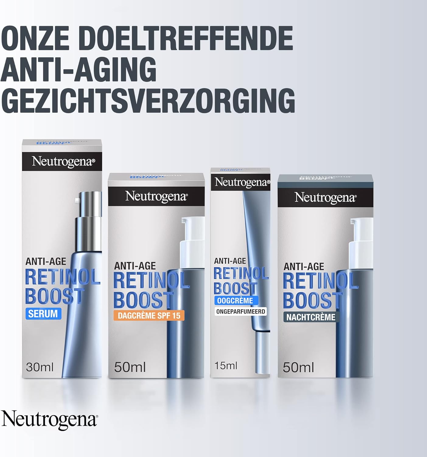Het Neutrogena Retinol Boost Serum is een uiterst effectief anti-aging gezichtsserum met pure Retinol, mirtebladextract en hyaluronzuur, voor een jongere en gezond uitziende huid. Het gezichtsserum bestrijdt zichtbare tekenen van huidveroudering: rimpels, verminderde strakheid, vermoeide huid, droogheid en pigmentvlekken. Daarnaast verbetert dit anti-aging serum het huidbeeld, zorgt voor een gelijkmatige teint en maakt de huid gladder. De unieke formule combineert pure Retinol om de collageenproductie te bevorderen, mirtebladextract om de effectiviteit van Retinol te verhogen en hyaluronzuur voor intensieve vochtigheid en een vollere huid. Het anti-aging gezichtsserum is zo effectief dat bij 100% van de proefpersonen na 1 week een zichtbare werking bevestigd werd*. Gebruik: Doe 1x per dag 2 pompjes van het serum aan op je hand en masseer het daarna zacht in op uw gezicht en hals. (*Wetenschappelijke evaluatie door dermatologen met 31 proefpersonen, bij 1x per dag aanbrengen)