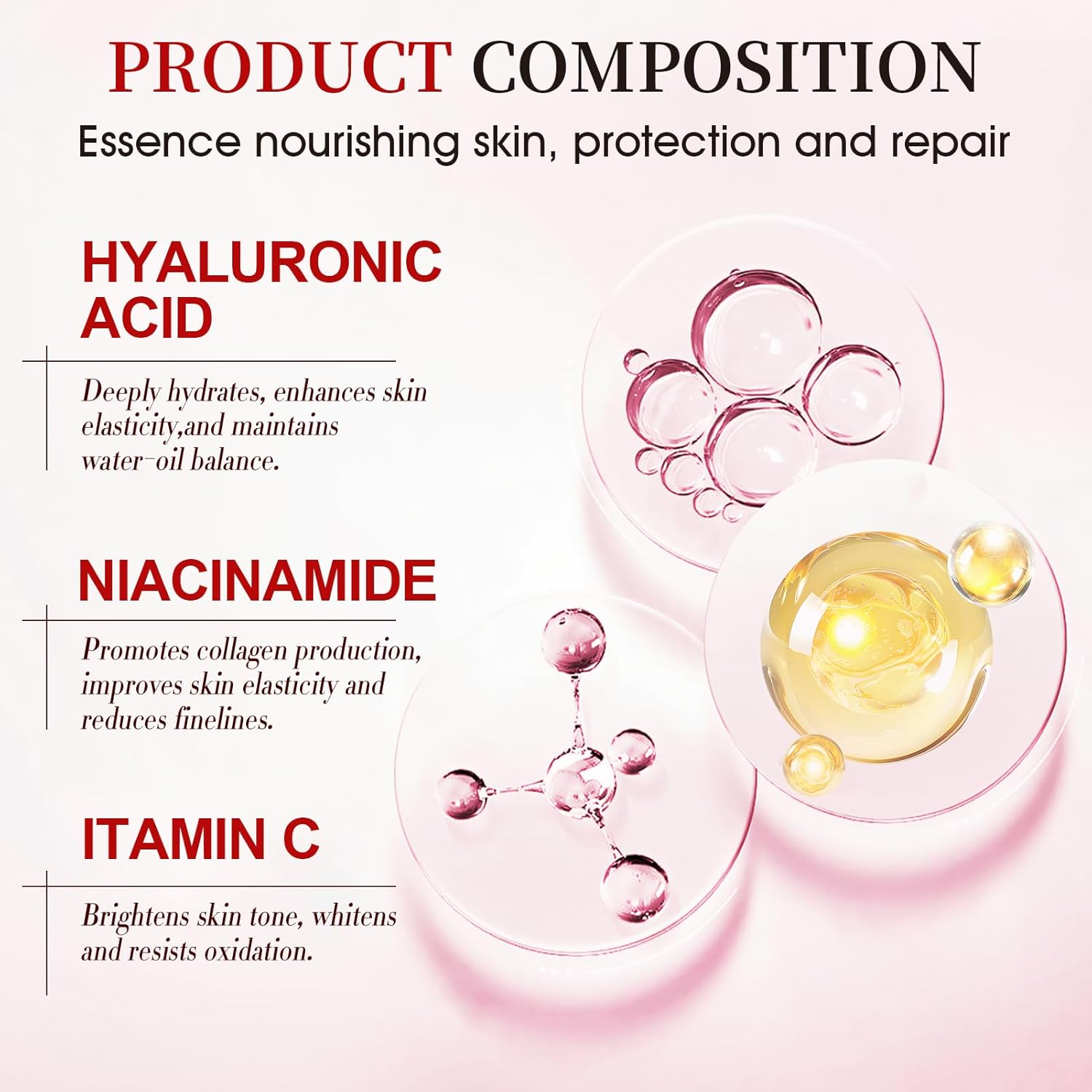 Gezichtssetenset: bevat niacinamide-essence + roze peptide-essence die de huid voedt en deze fris, glad en gelijkmatig kan maken. Geeft je huid stabiliteit, uitstraling en elasticiteit en laat je huid er jonger uitzien.