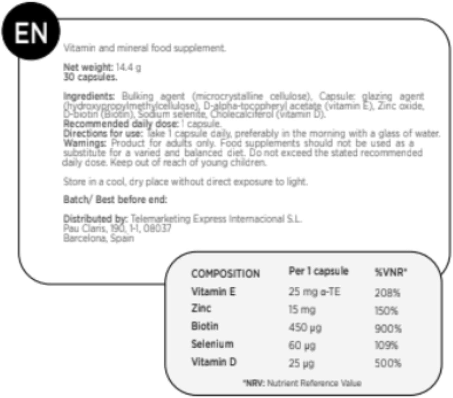 El producto viene en un bote perfectamente precintado con 30 pastillas. Estas son de tamaño medio y fáciles de ingerir.Se toma una cápsula al día por las mañanas por lo que tenemos tratamiento para un mes.Se trata de un producto natural sin aditivos, conservantes ni colorantes.La composición es buena ya que contiene Biotina, Zinc, Selenio, Vitamina D y Vitamina E todos ellos componentes muy beneficiosos para la piel, cabello, uñas, huesos y músculos.El precio me parece algo excesivo ya que sale a más de 1 euro al día, exactamente 1,20 euros.Además un tratamiento que dure solo un mes no me parece que sea tiempo suficiente para ver si el producto funciona.