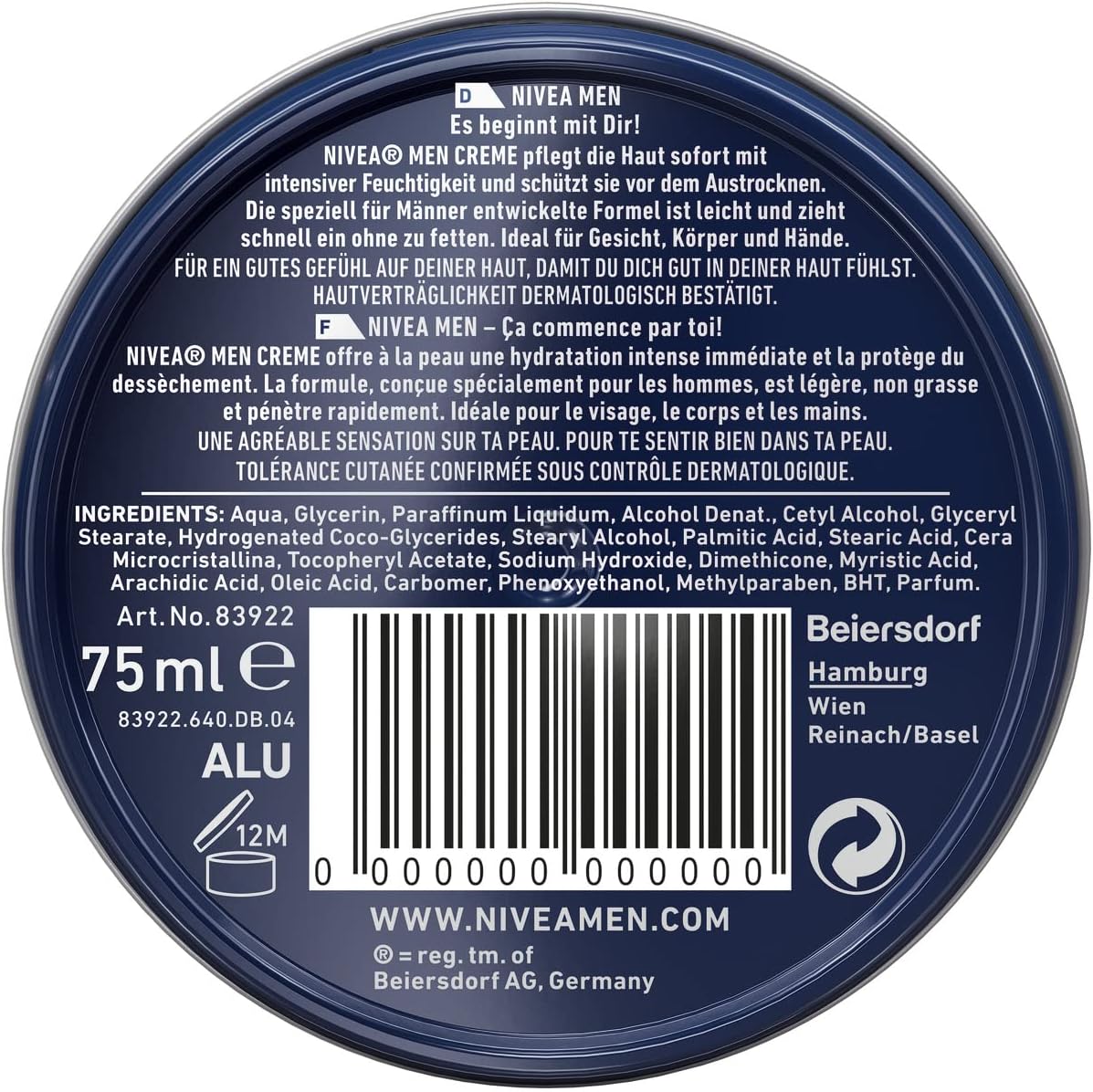 Inhoud van de levering: Nivea Men crème (75 ml), universele crème voor mannen voor intensief vocht, ideaal als gezichtscrème of lichaamscrème, artikelnummer 83922