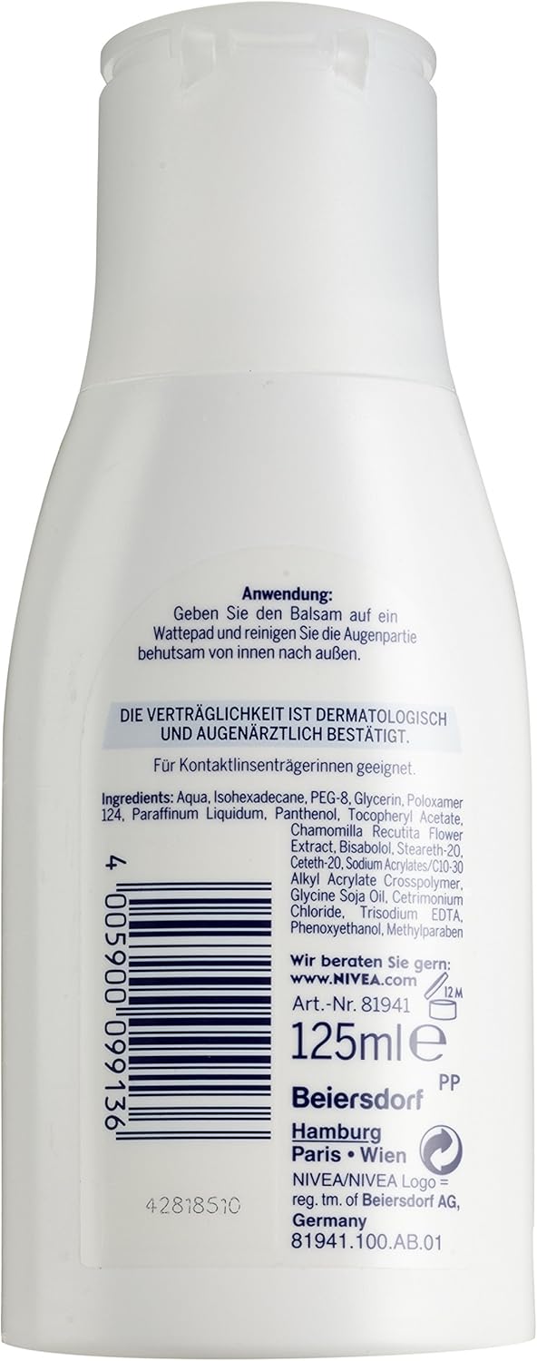 Voor een zachte en intense zuivere oogpartijtie: de waterbestendige oogmake-up remover met kamille-extract en provitamine B5 reinigt de gevoelige delen van de ogen en verwijdert waterdichte mascara en make-up. – Ingrediënten: aqua, isohexadecane, PEG-8, glycerine, poloxamer 124, paraffinum vloeistof, panthenol, tocopheryl acetaat, Chamomilla Recutita Flower Extract, bisabolol, Steareth-20, Ceth-20, natriumacrylates/C10-30 alkyl acryl. crosspolymeer, Glycine soja olie, cetrimoniumchloride, trisodium EDTA, fenoxyethanol, methylparaben, productdetails – 1 Nivea oogmake-up remover voor waterdichte oogmake-up in fles, 125 ml