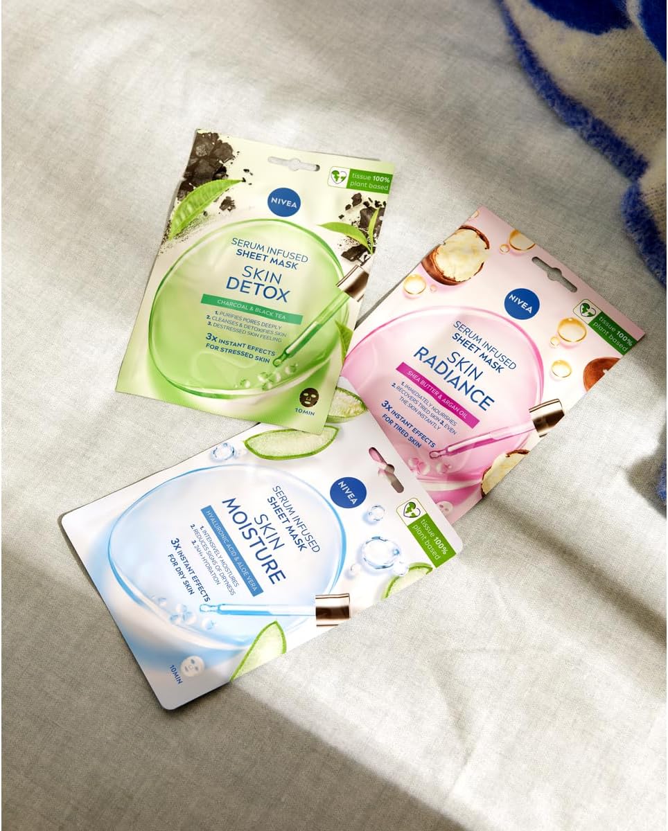 Dagelijkse stress, milieu en vervuiling kunnen je huid er grijs en moe uit laten zien. Neem 10 minuten de tijd om te ontspannen en laat het Nivea Skin Detox gezichtsmasker je huid weer gezond laten stralen. Het gezichtsmasker is sterk gehydrateerd met een formule die rijk is aan hydraterende serums, actieve kool en zwarte thee-extract. Dit reinigende gezichtsmasker geeft je huid een gezonde, natuurlijke glans en verlicht je huid. Voedt de huid intensief en laat een gladmakend effect achter. Gebruik tweemaal per week een vochtinbrengend gezichtsmasker om je huid er gezond uit te laten zien. Voor een nog aangenamer effect leg je het masker voor gebruik in de koelkast