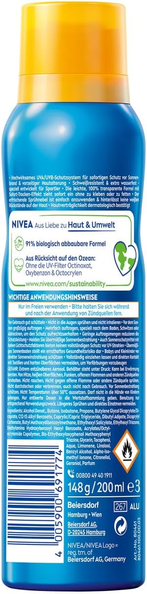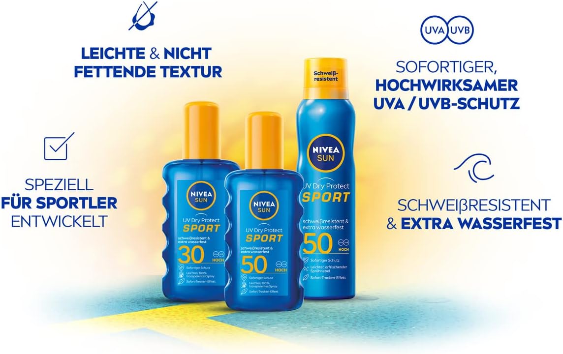NIVEA Sun UV Dry Protect Sport spuitnevel met SPF 50 is speciaal ontwikkeld voor sporters en biedt onmiddellijke bescherming tegen de zon met direct drogeeffect. Dankzij zeer effectieve UVA/UVB-filters beschermt de verfrissende zonnecrème voor het sproeien effectief tegen huidschade door zonnestraling en vroegtijdige huidveroudering door de zon. De extra watervaste en zweetbestendige spray met de 100% transparante formule trekt onmiddellijk in, zonder witte resten op de huid en laat geen vettig of kleverig huidgevoel achter. Hij spuit vanuit elke hoek en is ideaal voor gebruik tijdens het sporten. De huidtolerantie is dermatologisch getest.