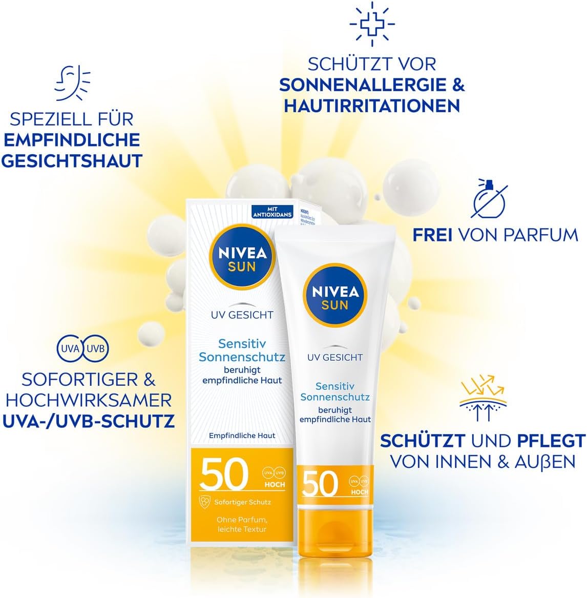 Nivea Sun UV-gezichtsgevoelige zonbescherming: beschermt de gevoelige gezichtshuid tegen zonnebrand en kalmeert huidirritaties.