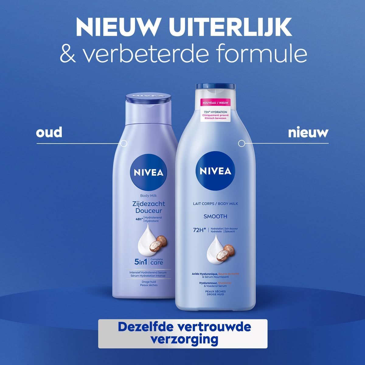 Geef je huid de verzorging die ze verdient met de vernieuwde NIVEA Zijdezachte Body Milk. Deze bodymilk heeft een nieuwe en verbeterde formule die speciaal ontwikkeld is om droge huid intensief te voeden en langdurig gehydrateerd te houden. Met een klinisch bewezen werking hydrateert deze formule je huid tot wel 72 uur lang*, waardoor je huid zacht, soepel en zijdezacht aanvoelt, dag na dag. De rijke samenstelling is verrijkt met puur hyaluronzuur, bekend om zijn krachtige vochtvasthoudende eigenschappen, en voedende sheaboter die je huid een intens verzorgend effect geeft. Daarnaast bevat de bodymilk een speciaal voedend serum dat helpt de natuurlijke barrièrefunctie van je huid te ondersteunen, waardoor vochtverlies wordt verminderd en je huid een gezonde uitstraling behoudt. Deze bodymilk is perfect voor mensen met een droge huid die op zoek zijn naar een product dat niet alleen hydrateert maar ook een zijdezachte finish geeft. *Instrumentele test uitgevoerd met 43 vrijwilligers.