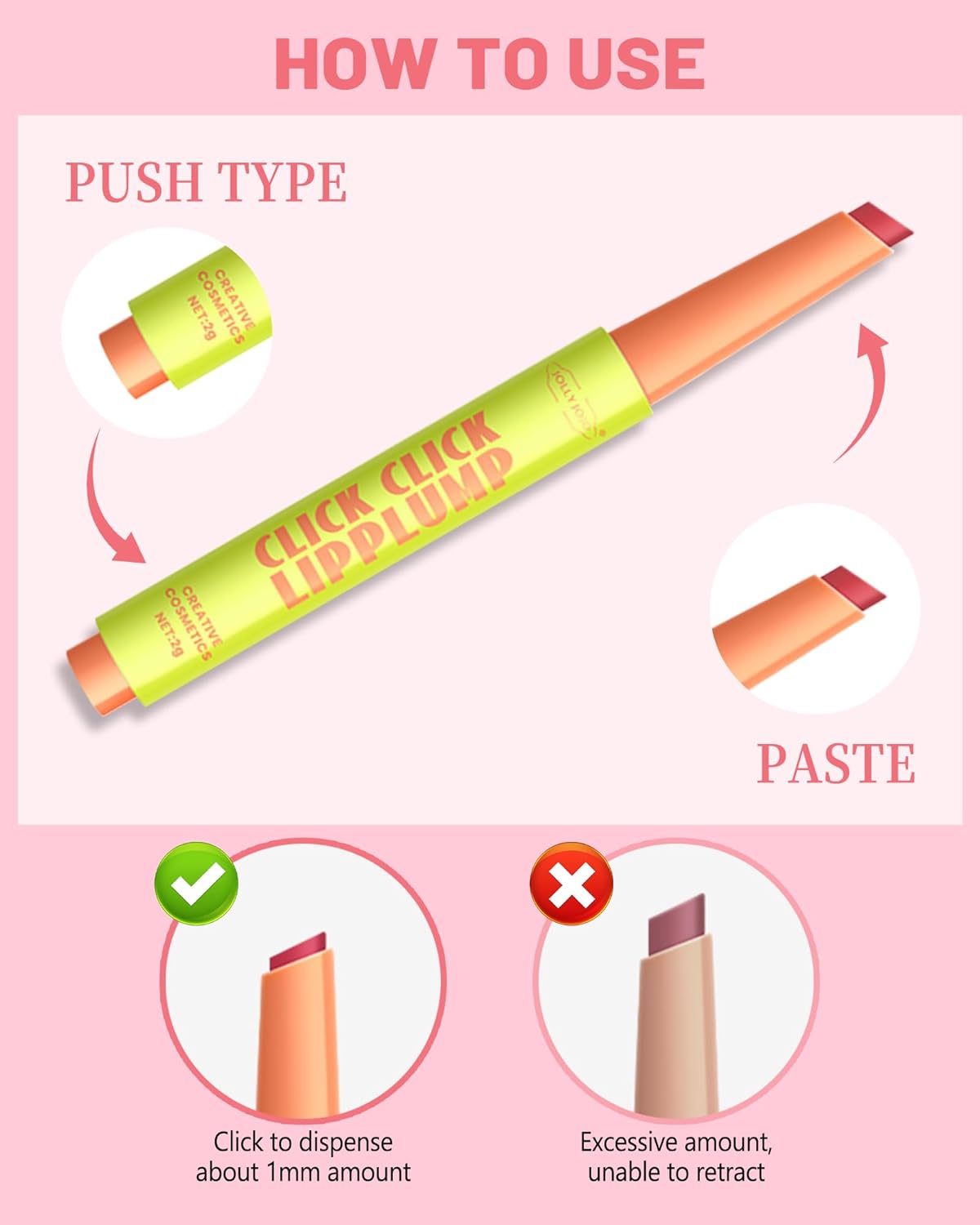 Click Lipstick – Our tinted lip balms are clickable, a non-retractable product that does not absorb by pressing too hard. To make it easier to apply, press the bottom according to use. We recommend pressing 1-2 times at a time, squeezing out 1 mm product and applying gently.