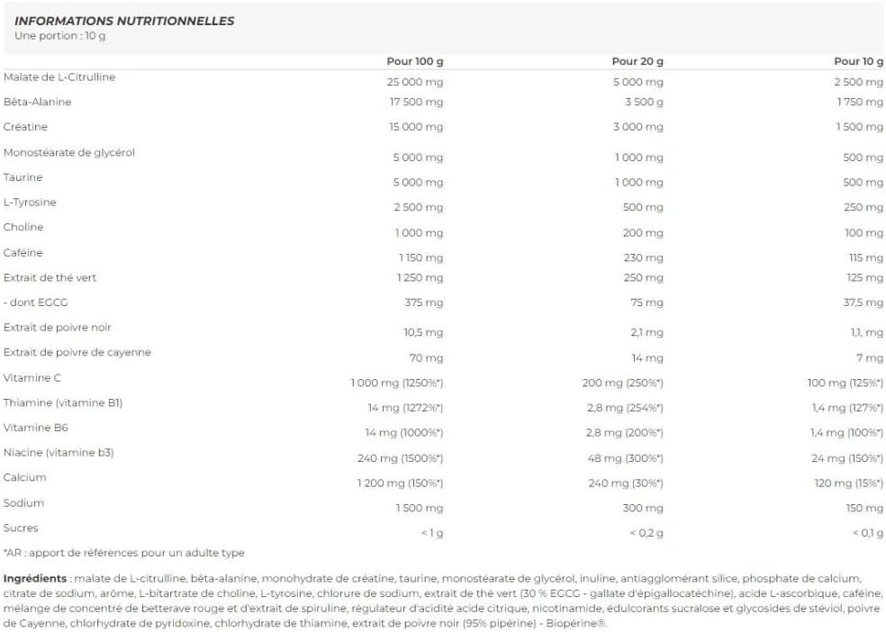 De Bioperine die N1 Pro Pre Workout bevat, helpt de biologische beschikbaarheid van voedingsstoffen te vergroten. Deze booster is zeer compleet, met een mix van vitaminen uit de B- en C-groep en mineralen zoals calcium en natrium. Het bevat ook creatine, in een concentratie van 1.500 mg per dosis van 10 g. Creatine is bijzonder heilzaam: 3 g per dag verbetert de fysieke capaciteit tijdens opeenvolgende periodes van zeer intensieve inspanning van korte duur.