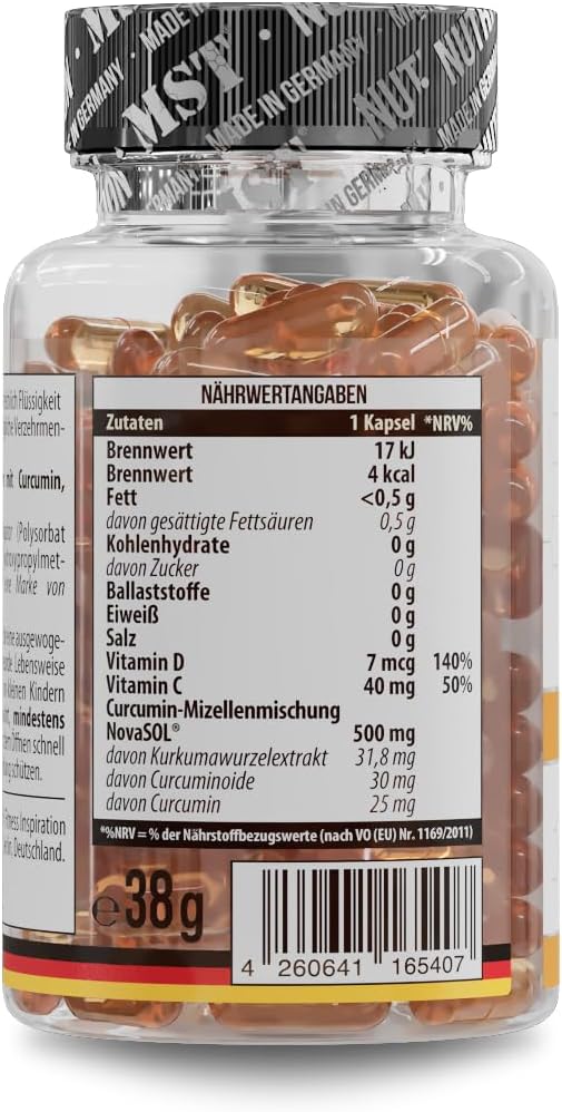 De kurkumine capsules NovaSOL van MST Nutrition leveren 500 mg hooggedoseerde curcumine in een gemakkelijk absorberende micellaire vorm. Dankzij de innovatieve NovaSol-technologie bereikt de curcumine een buitengewoon hoge biologische beschikbaarheid. Verrijkt met vitamine C en D, versterken de capsules het immuunsysteem en bevorderen de gezondheid van de botten. Met een verpakking van 60 capsules krijg je een voorraad van twee maanden van hoogwaardige supplement. Made in Germany, gegarandeerd zonder additieven, zijn ze ideaal voor iedereen die zijn gezondheid doelgericht wil ondersteunen.