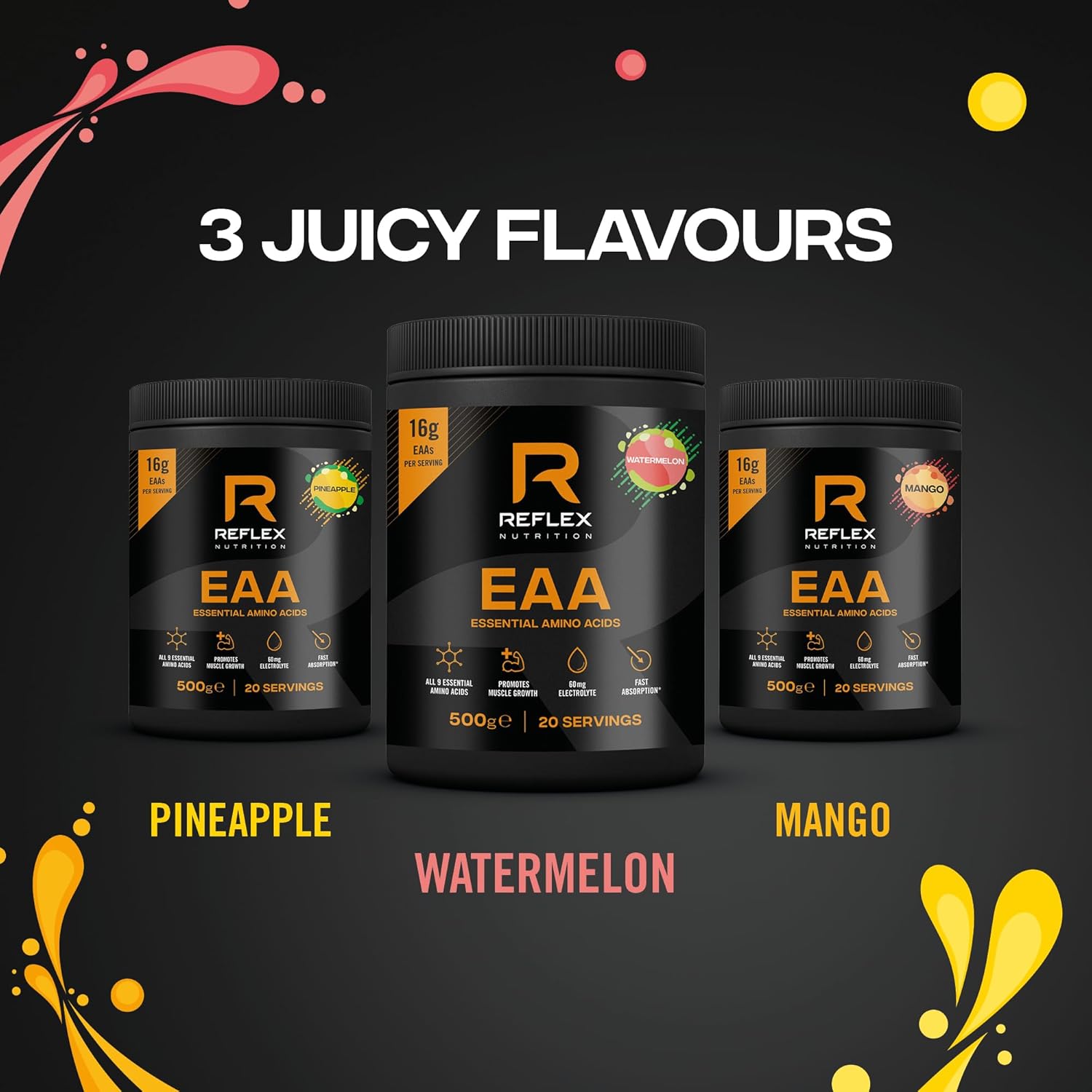 Aminozuren zijn de bouwstenen van eiwitten, die de groei en het onderhoud van spieren helpen bevorderen. Essentiële aminozuren zijn de aminozuren die je lichaam nodig heeft, maar niet zelf kan aanmaken. Je kunt ze alleen via je dieet binnenkrijgen door dingen als vlees of eieren te eten, of een handig supplement zoals dit te nemen. Er zijn in totaal negen essentiële aminozuren – drie vertakte ketenaminozuren (BCAA’s) en zes andere essentiële aminozuren. Reflex’s EAA’s geven u 16 g EAA’s per portie, waardoor het een eersteklas bron van essentiële aminozuren is om spiergroei te bevorderen.