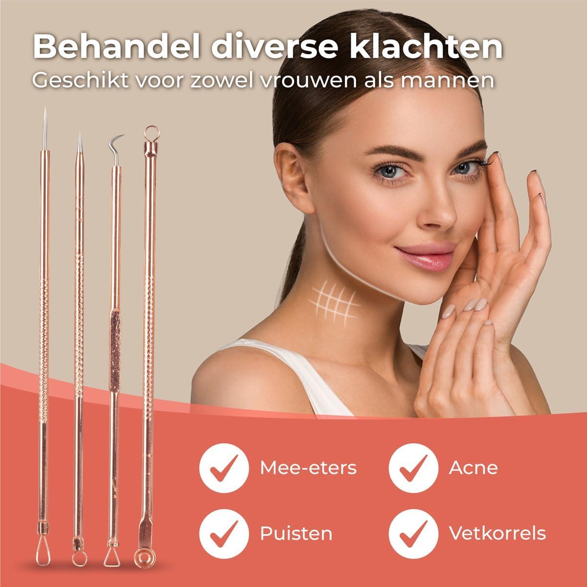 [VOORDELEN VAN ONZE MEE ETERS VERWIJDEREN SET] Vier roestvrijstalen tools voor mee-eterverwijdering; Ergonomisch ontwerp voorkomt huidbeschadiging; Duurzaam, herbruikbaar en makkelijk schoon te maken; Houdt de huid schoon en gezond zonder irritatie; Professionele kwaliteit voor thuisgebruik, bespaart tijd en geld.