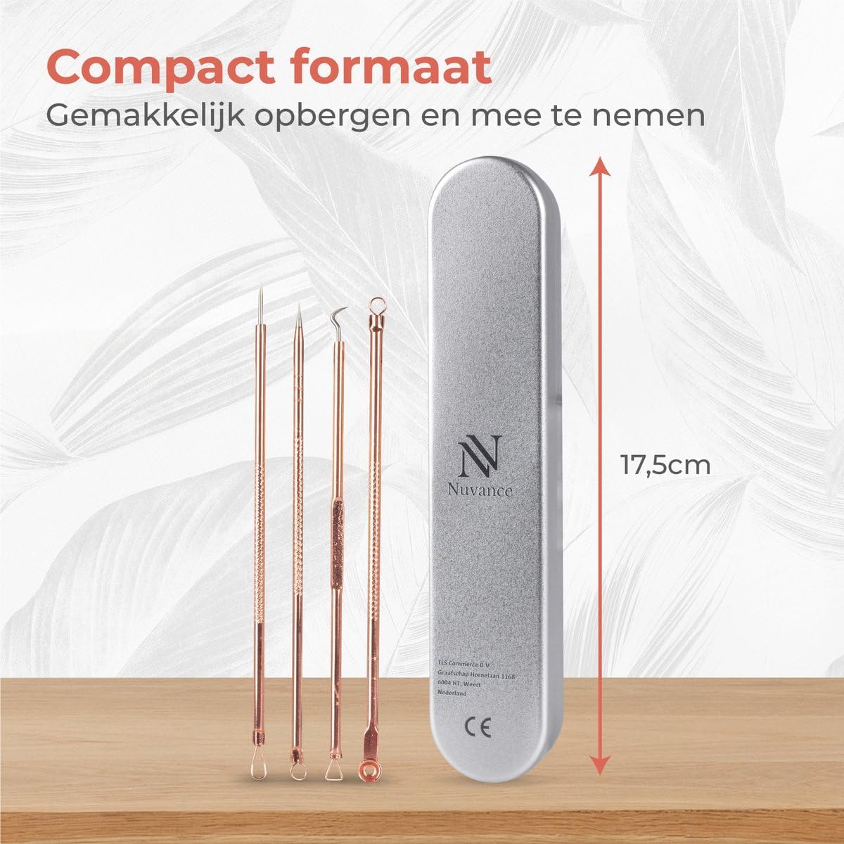 Ontdek de ultieme oplossing voor een heldere, zuivere huid met de Nuvance mee-eters verwijderen set. Met vier professionele roestvrijstalen tools biedt deze kit een precieze en hygiënische aanpak voor mee-eters en puistjes. Verwen je huid met de perfecte tools voor een moeiteloze en effectieve reiniging, zonder irritatie.