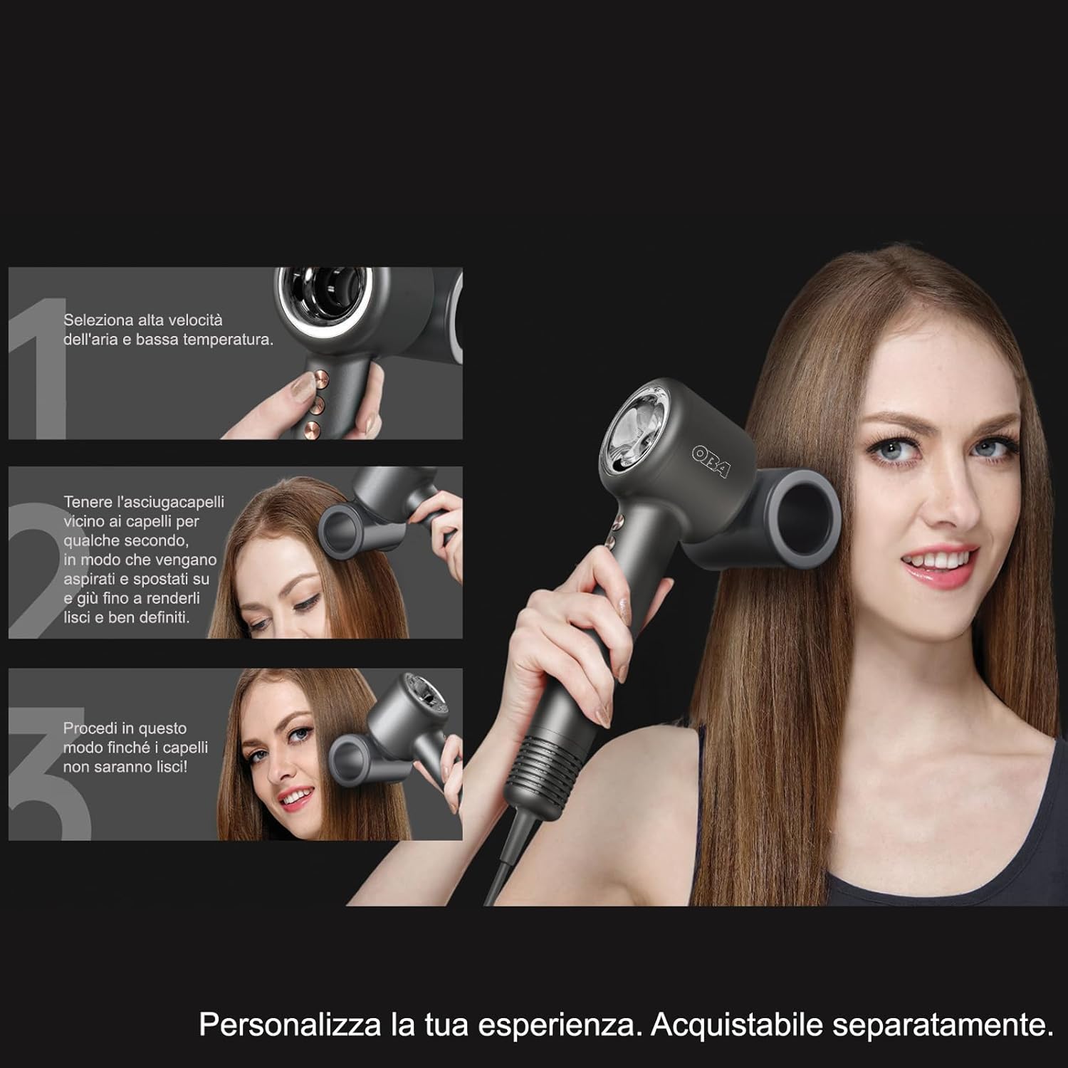 Inutile nasconderlo: questo phon assomiglia tantissimo al celeberrimo modello Dyson, che però ha un prezzo davvero fuori dal mondo.Se ci si accontenta di una alternativa questo phon OBA-HY01PRO può essere un’ottima scelta.Specifiche tecniche e dal design simile, dopo alcune settimane di utilizzo, posso dire che è stata una bellissima scoperta!Il design è davvero molto simile a quello del Dyson: minimal, moderno e con il motore integrato nell’impugnatura, che lo rende **maneggevole e ben bilanciato**. Il phon è anche **molto leggero** (pesa poco più di 350 grammi) e si può usare tranquillamente anche per una piega un po’ più lunga senza affaticarsi.Ma la cosa che mi ha colpita di più è la potenza del getto d’aria: asciuga i capelli in metà del tempo rispetto al mio vecchio phon, ma senza bruciarli o seccarli.Anzi, grazie agli ioni negativi, i capelli risultano più morbidi, lucidi e meno crespi.Un altro aspetto interessante è la sua silenziosità: confermo i 54 decibel dichiarati, lo uso la mattina presto e non disturbo nessuno in casa. Molto apprezzato!Tutti i controlli sono intuitivi e sono presenti gli accessori che servono, dal beccuccio concentratore alla bocchetta per il volume, e persino un pratico supporto a parete per appenderlo.In conclusione, se anche voi stavate pensando al Dyson ma non volete spendere una fortuna, questo phon è una validissima alternativa.Stesse sensazioni premium, ma a un prezzo molto più ragionevole. Lo consiglio davvero!