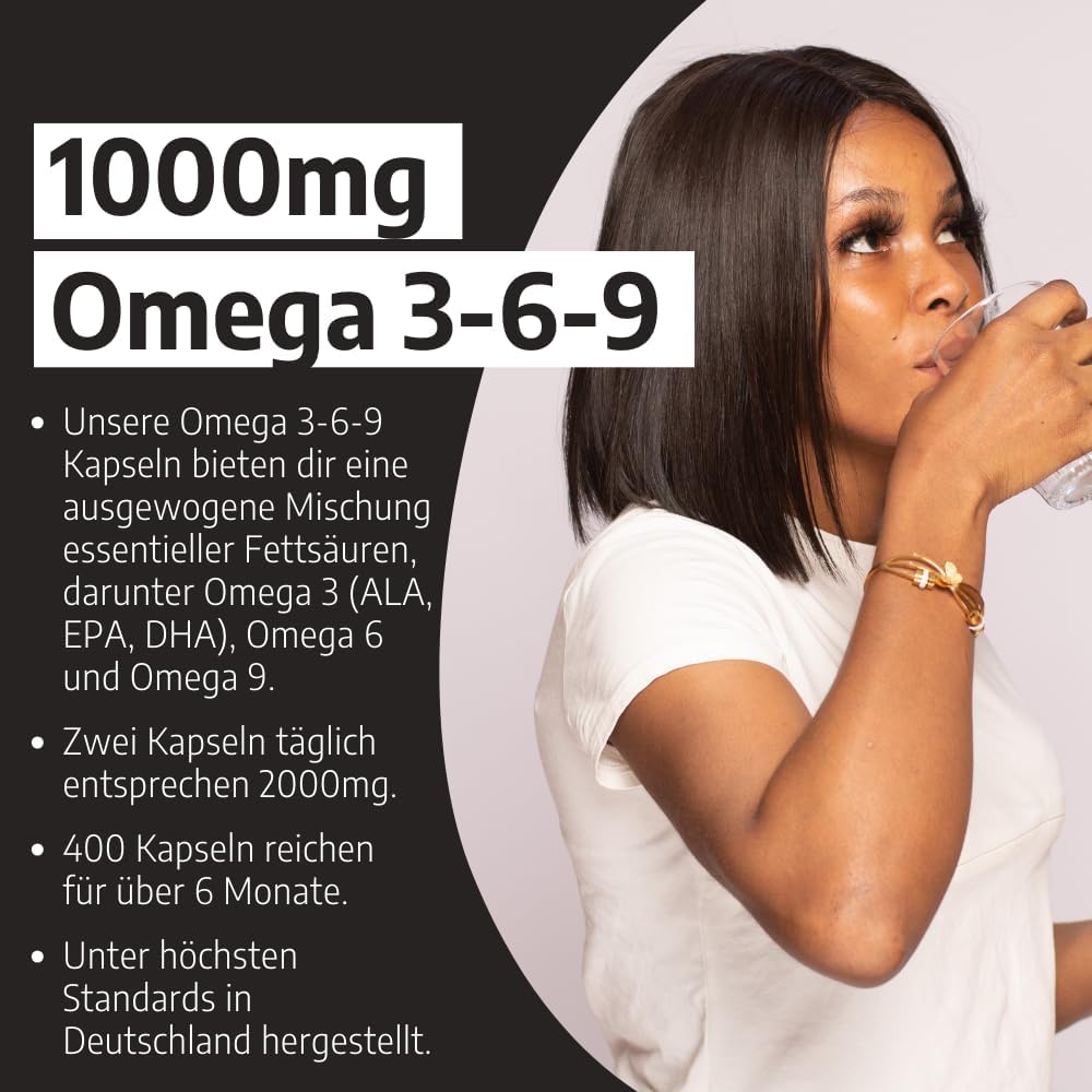 Optimale biologische beschikbaarheid: Omega 3-6-9 capsules bieden je een evenwichtige mix van essentiële vetzuren, waaronder Omega 3 (ALA, EPA, DHA), Omega 6 en Omega 9. De hooggedoseerde softgelcapsules van premium kwaliteit bevatten 1000 mg per capsule.