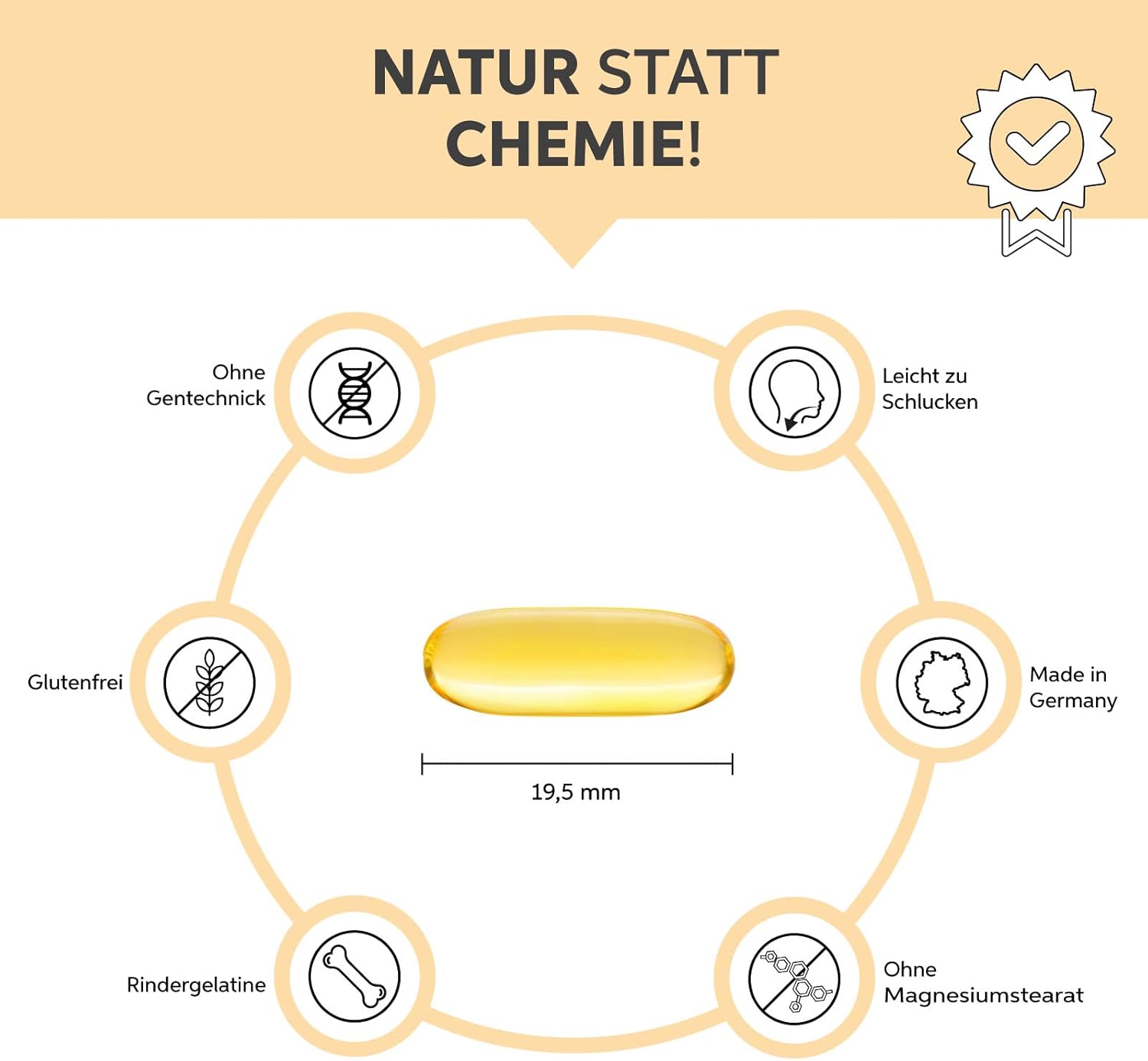 Premium omega-3 capsules: 3000 mg omega-3 visolie per dagelijkse dosis (3 capsules per dag). Optimale EPA/DHA 1:2-verhouding. Gemakkelijk in te slikken kleine zachte gel-capsules.