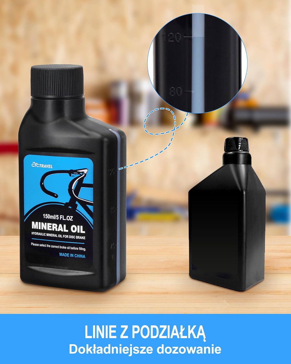 Remontluchtingsset: 1flessen minerale olie remvloeistof (150 ml), 1 trechter, 1 ontluchtingsspuit, 1 plastic slang, 2 metalen connectoren.