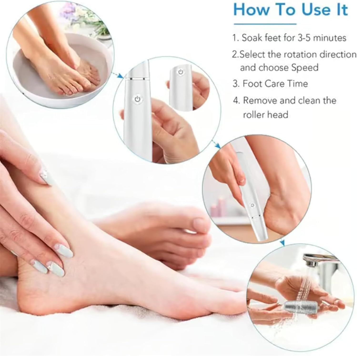 360° Rotating Action for Effective Callus Removal: The device features a powerful motor with a 360° rotating roller head, designed to efficiently remove dry, cracked skin and stubborn calluses, leaving your feet smooth and soft in minutes