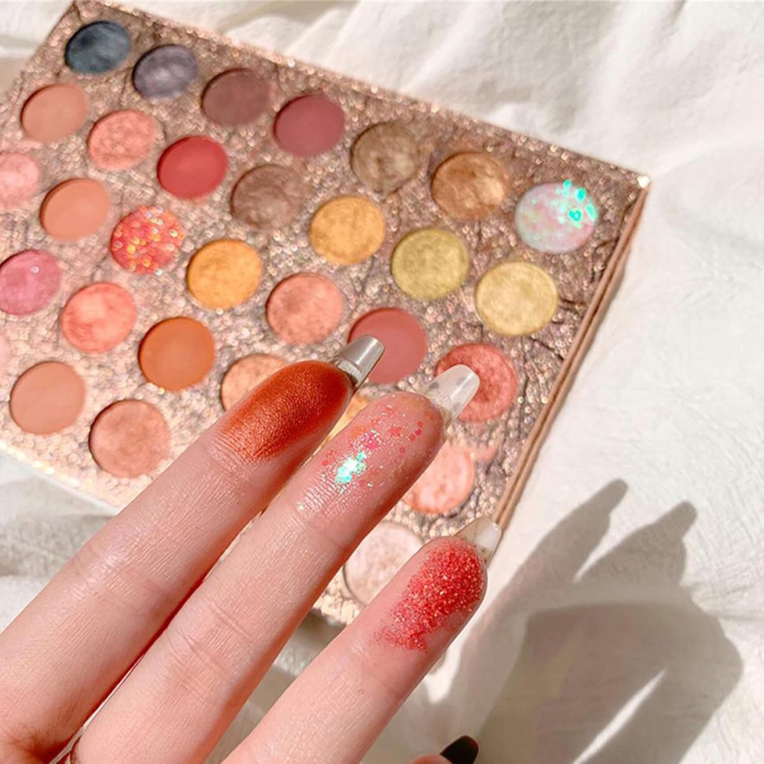 35 intense kleuren: het palet bevat niet minder dan 35 kleuren, waardoor zo’n rijke oogschaduwset geschikt is voor elke vrouw, omdat elk van hen de juiste kleur vindt. Het palet bevat ingetogen kleuren zoals aarde- en nude-tinten in matte tinten die kunnen worden gebruikt voor dagelijkse make-up, bijvoorbeeld voor werk. Onze set bevat ook sappigere kleuren zoals goud en rood voor een avond.