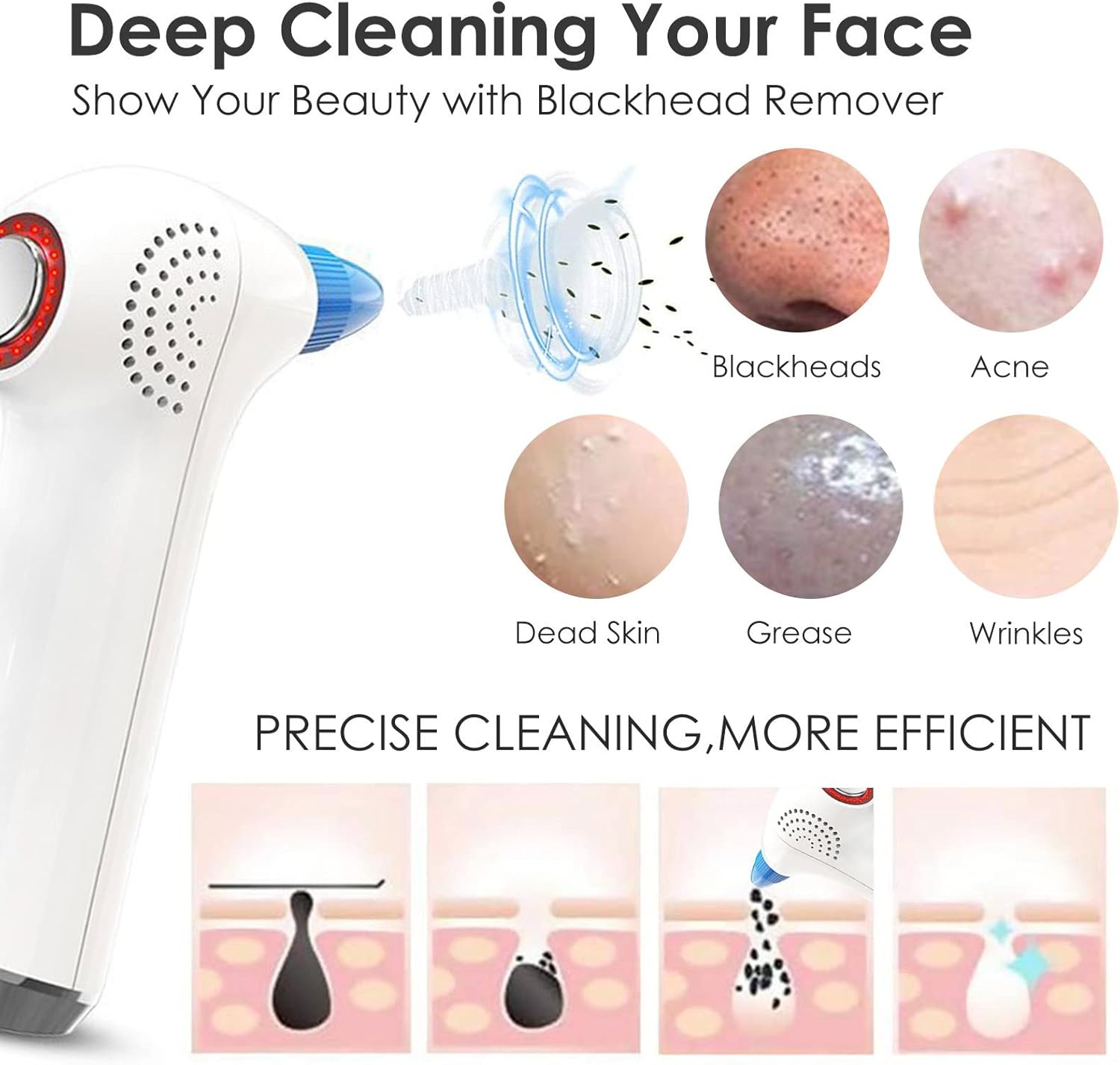 ⋑[Een gevoel van uniciteit] Blackhead Remover Pore Vacuum is geschikt voor alle huidtypes van mannen en vrouwen, met 4 soorten functionele zuigkoppen in verschillende delen, u kunt versnellingen aanpassen en zuigkoppen selecteren op basis van uw behoeften, met 5 niveaus van zuig- en 4 zuigkoppen.