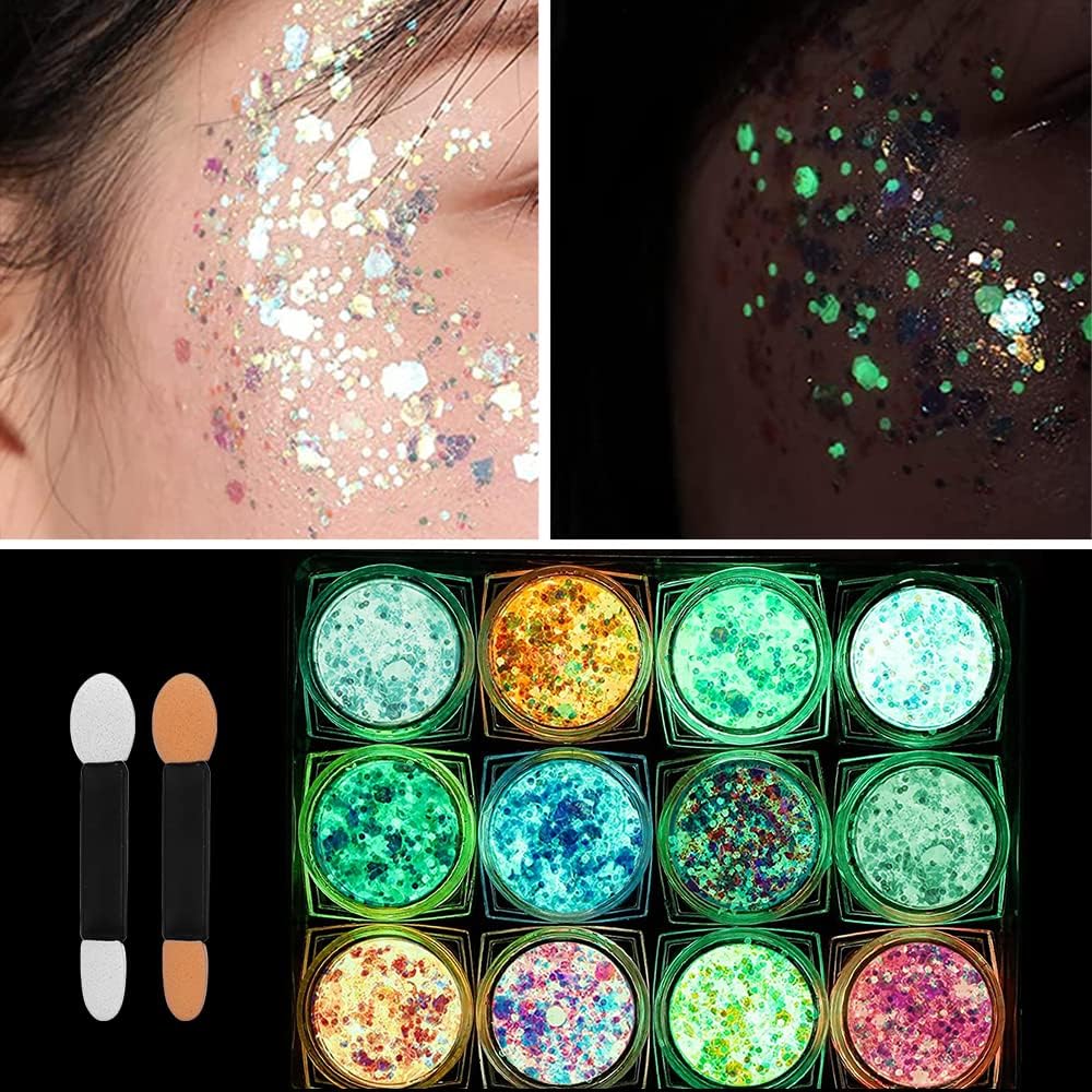 Oplichtende glittergel, 12 kleuren make-up glitter, holografische pailletten set, lichaamsglitter fluorescerende pailletten voor gezicht, lichaam, haar, schmink