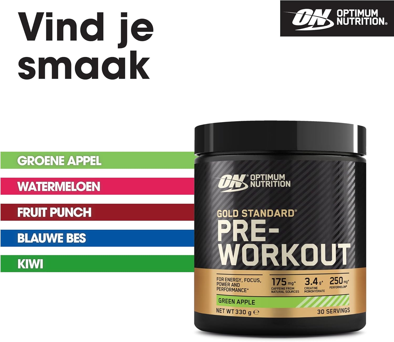 Ontdek Optimum Nutrition Gold Standard Pre Workout Powder. Deze kant-en-klare energiedrank is ontworpen om je focus, kracht en prestaties* voor en tijdens je training te verbeteren. ON Gold Standard voedingssupplement is Informed Choice gecertificeerd en bevat een zorgvuldig geselecteerde lijst van ingrediënten. Het zit vol met 175 mg cafeïne uit natuurlijke bronnen om de alertheid en focus voor de training te helpen verhogen*. Elke portie bevat 3,4 g creatinemonohydraat dat helpt je kracht en prestaties te ondersteunen. Deze heerlijk smakende sportdrank bevat ook vitamine B 1, B 3, B 5, B 6 en B 12, die allemaal bijdragen aan een normaal energieleverend metabolisme**. Bovendien bevat het ook Beta-Alanine (Carnosyn), Citrulline, L-Carnitine en N-Acetyl-Tyrosine. Een verscheidenheid aan smaken – Fruit Punch, Green Apple, Watermelon, Blue Raspberry en Kiwi – betekent dat je geen smaak hoeft op te offeren voor je energie, focus en prestatiewinst. Het pre-workout supplement is ontworpen voor iedereen: van degenen die net beginnen op hun weg naar een gezondere levensstijl tot atleten, hardwerkende studenten, professionals en fitnessliefhebbers. Optimum Nutrition Gold Standard Pre Workout Powder is een smakelijke opkikker die niet duur is en altijd en overal kan worden genoten; thuis, onderweg of in de sportschool. Om een lekkere shake te maken, voeg 1 schep toe aan 350 ml koud water, meng en serveer. *Bron: EFSA Journal 2011;9(4):2054 24 **Bron: VERORDENING (EU) Nr. 432/2012 VAN DE COMMISSIE
