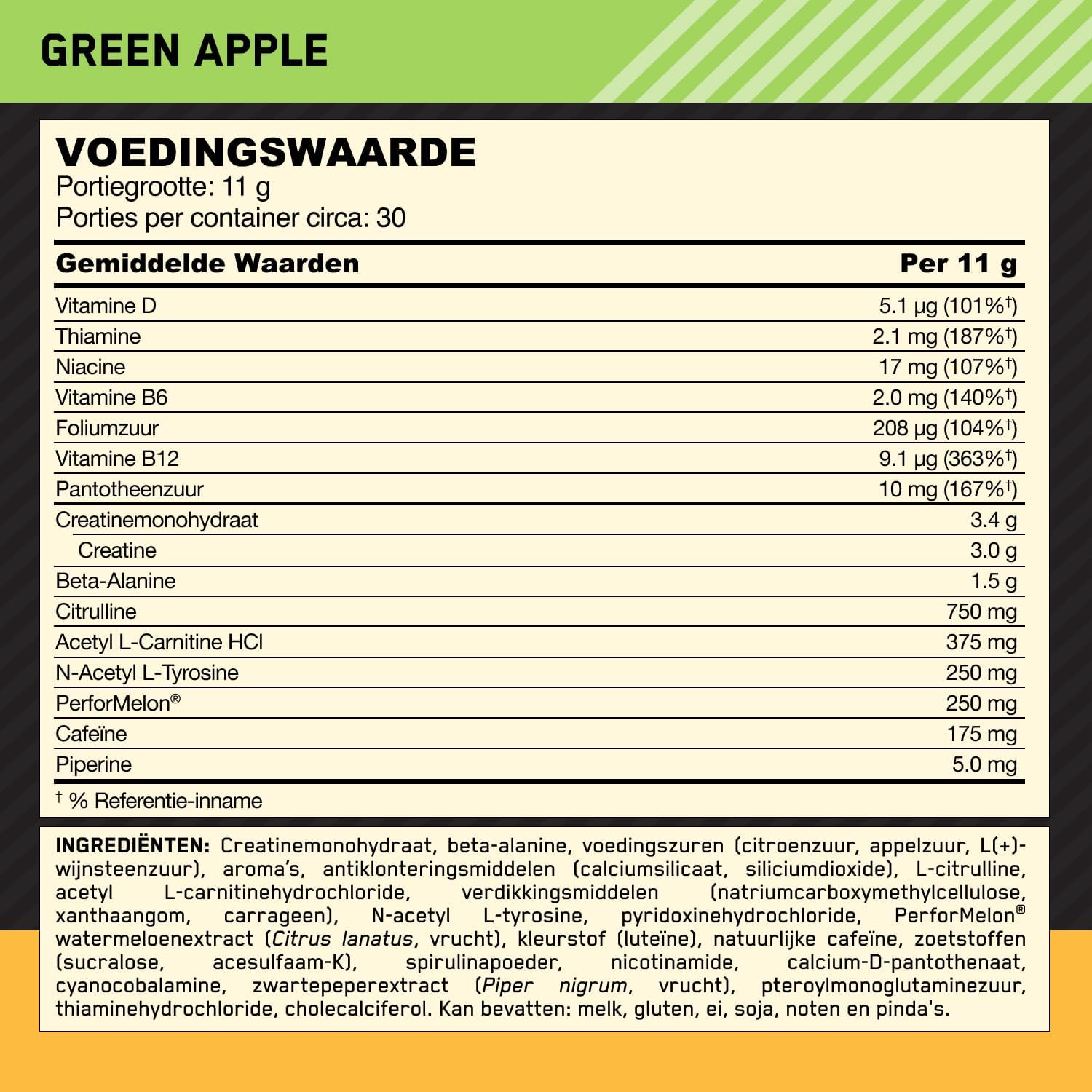 Optimum Nutrition Gold Standard Pre Workout Powder, Energiedrank met Creatine Monohydraat, Beta Alanine, Cafeïne en Vitamine B Complex, Voedingssupplement, Groene Appel smaak, 30 porties, 330 g