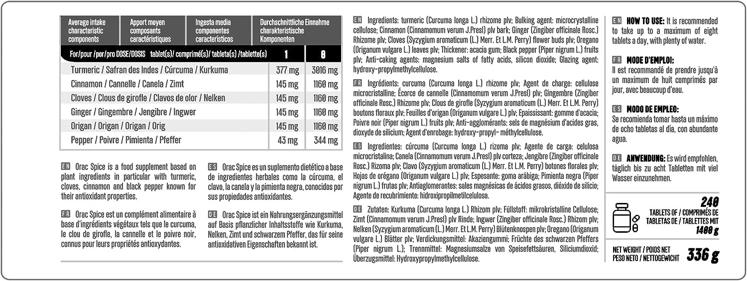 Orac Spice – gecombineerd kruidensupplement – kurkuma, peper, kaneel, kruidnagel, antioxiderende werking, gember, oregano, regelmatige darmtransport – 2 verpakkingen met elk 240 tabletten