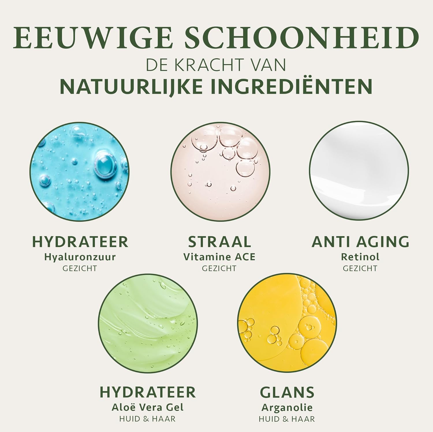 🎁LUXE CADEAUSET / MOEDERDAGGESCHENKEN – De 5-delige schoonheidsset combineert biologisch hyaluron-serum, biologische aloë vera-gel en biologische arganolie met de biologische retinolcrème en het biologische vitamine ACE-serum in een geschenkset waar uw dierbaren blij mee zullen zijn over. Het Bio ACE Serum combineert de voordelen van onze Vitamine C & Retinol (Vitamine A) serums met Vitamine E. Deze set biedt de huid de perfecte allround verzorgingsroutine – ‘s ochtends en ‘s avonds.