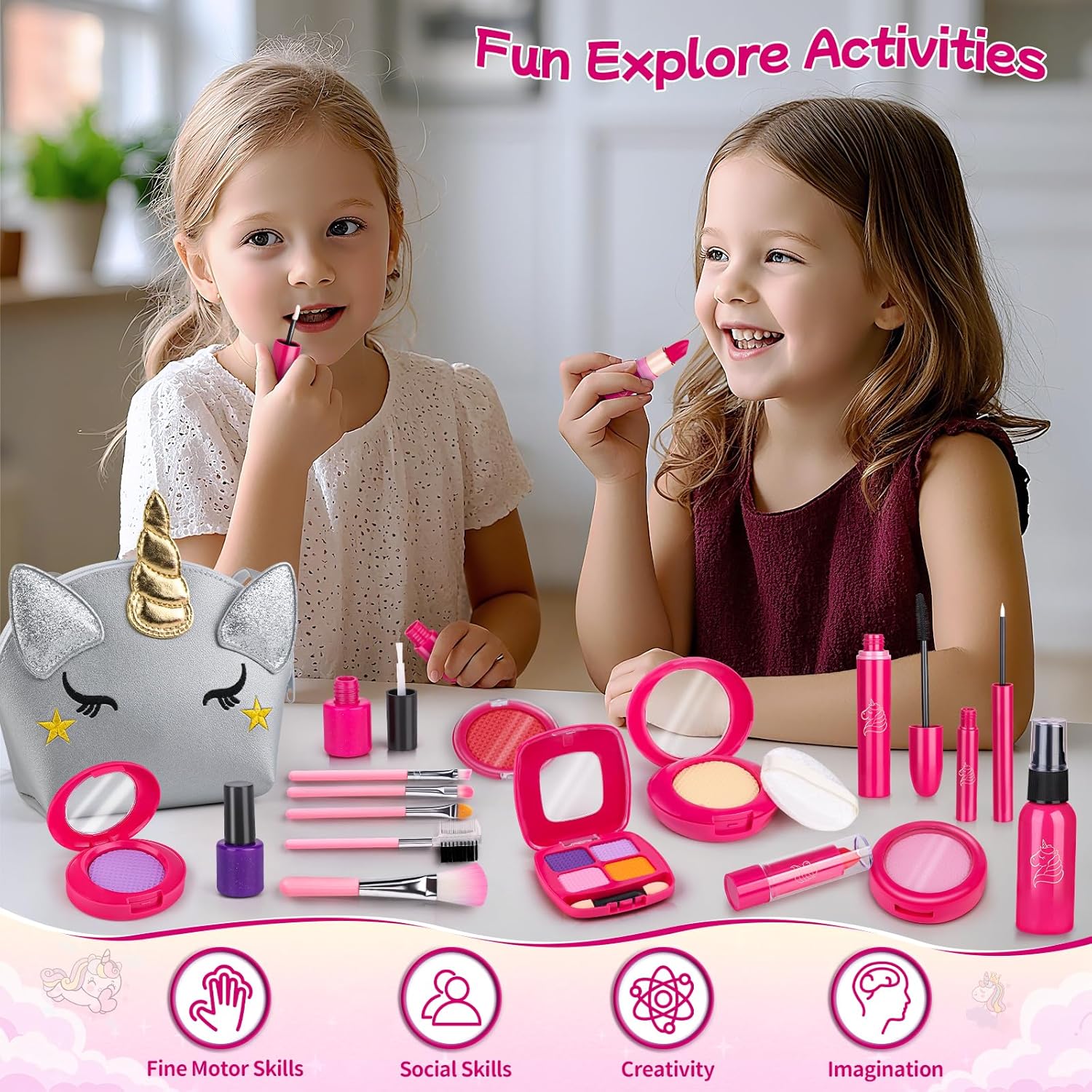 Perfect make-upcadeau voor kinderen: de make-upset voor peuters is bedoeld om de esthetiek van meisjes te verbeteren, de fantasie te stimuleren en de fijne motoriek te trainen en het vermogen om zelf op te maken. Kleine prinses kan zelf make-upkits spelen of spelen met ouders, vrienden of poppen. Dit is een goed cadeau voor kleine meisjes van 3 jaar en ouder.